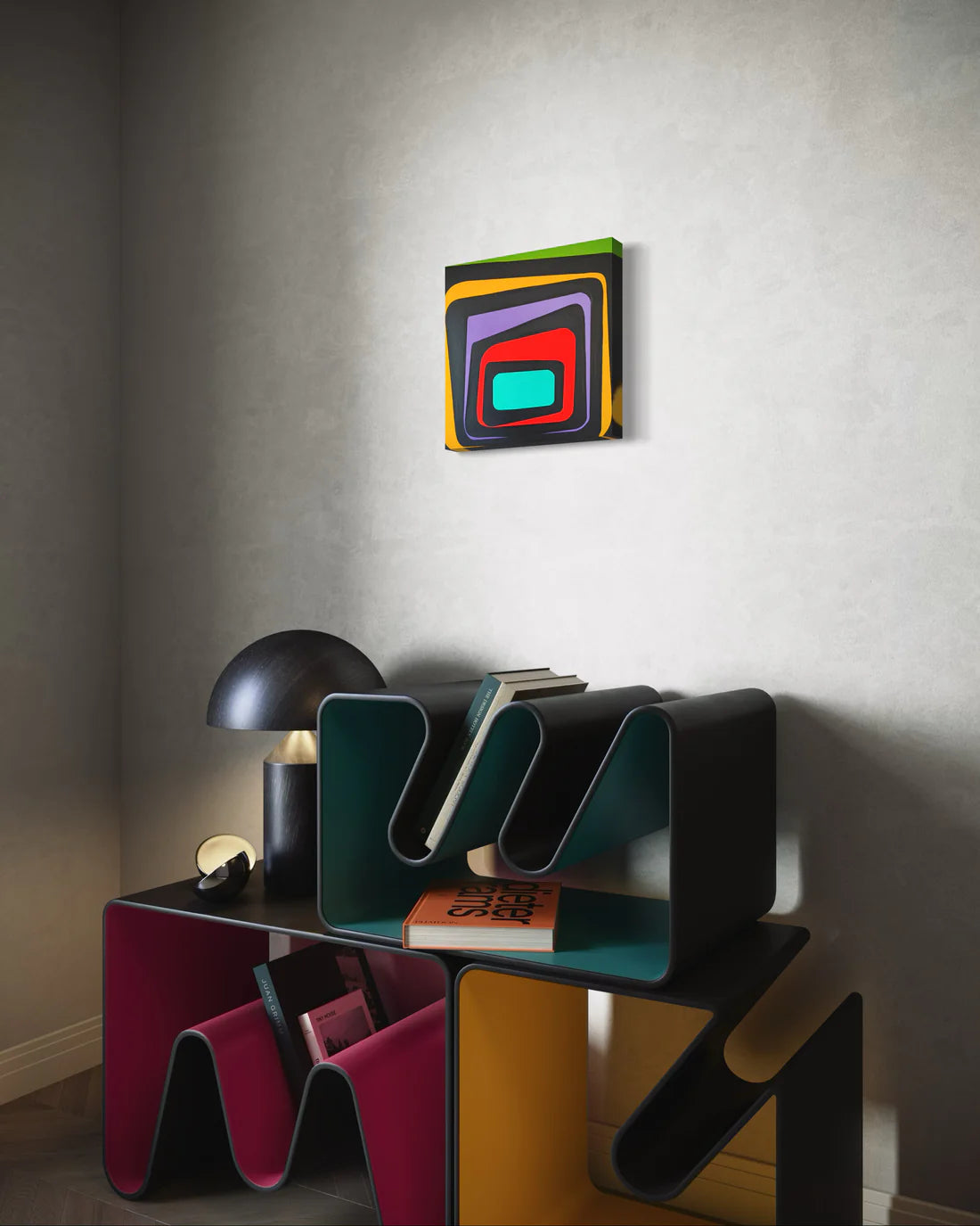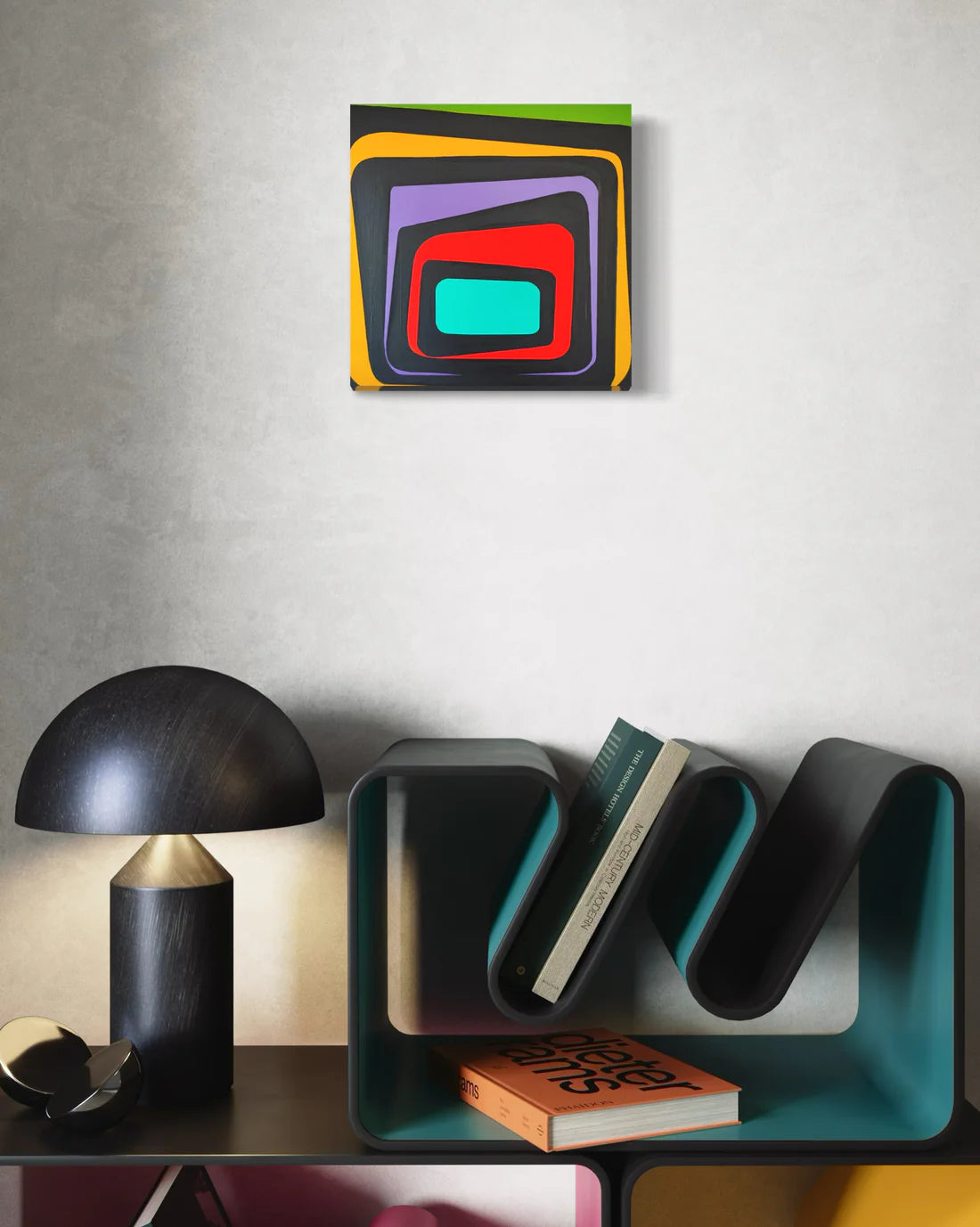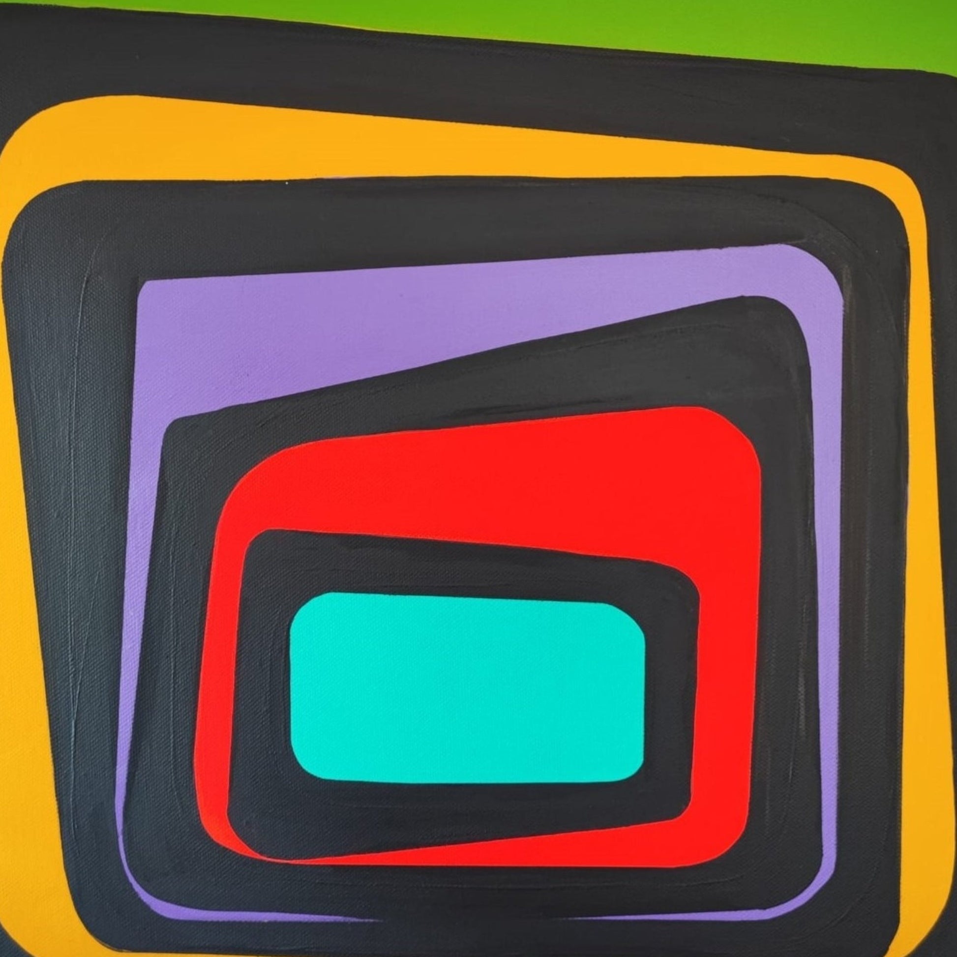 An abstract painting featuring overlapping rectangular shapes in vivid colors, including red, purple, yellow, green, and turquoise. The strong contrast between the colors and the use of black outlines create depth and movement, evoking a sense of retro, geometric precision.
