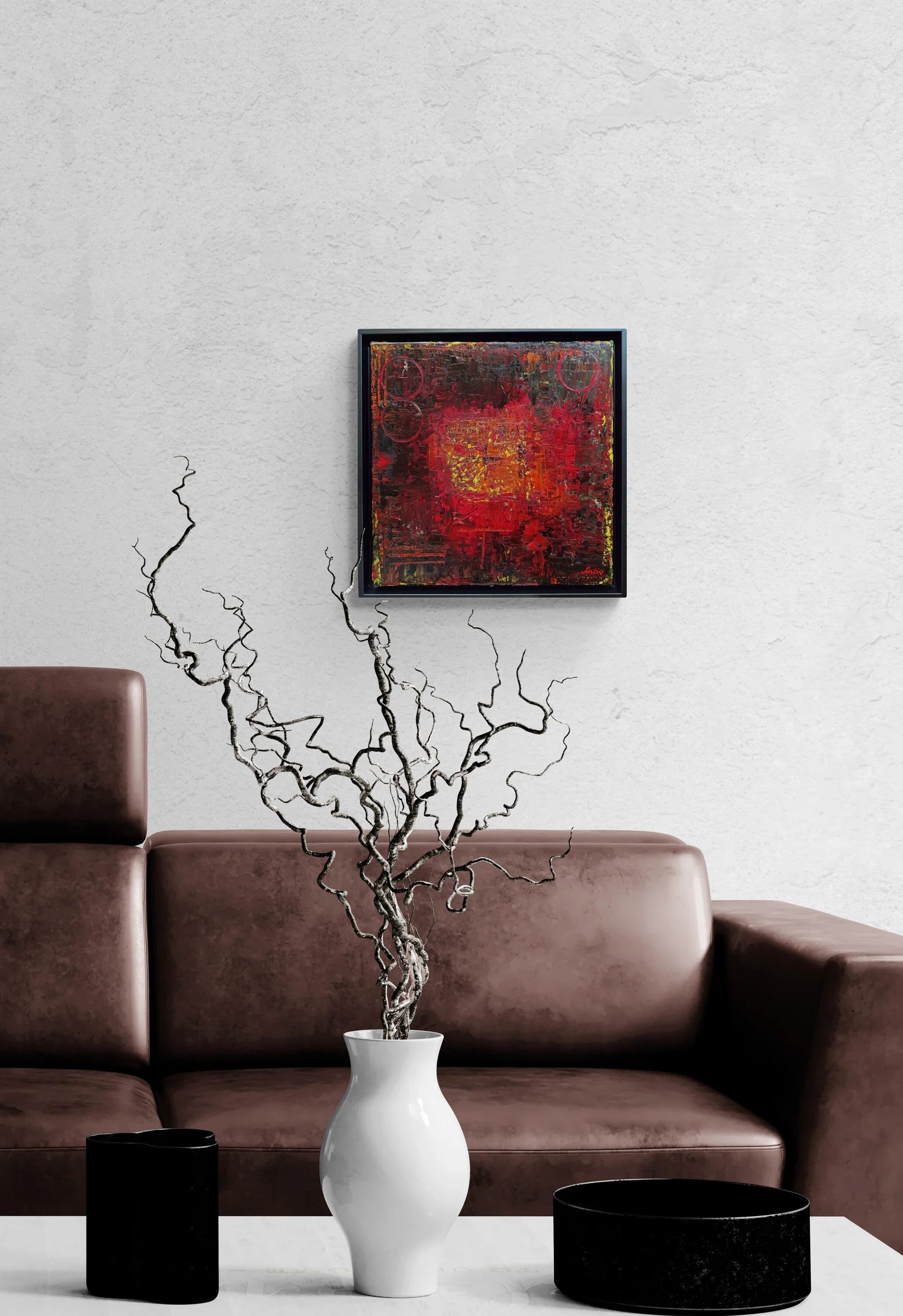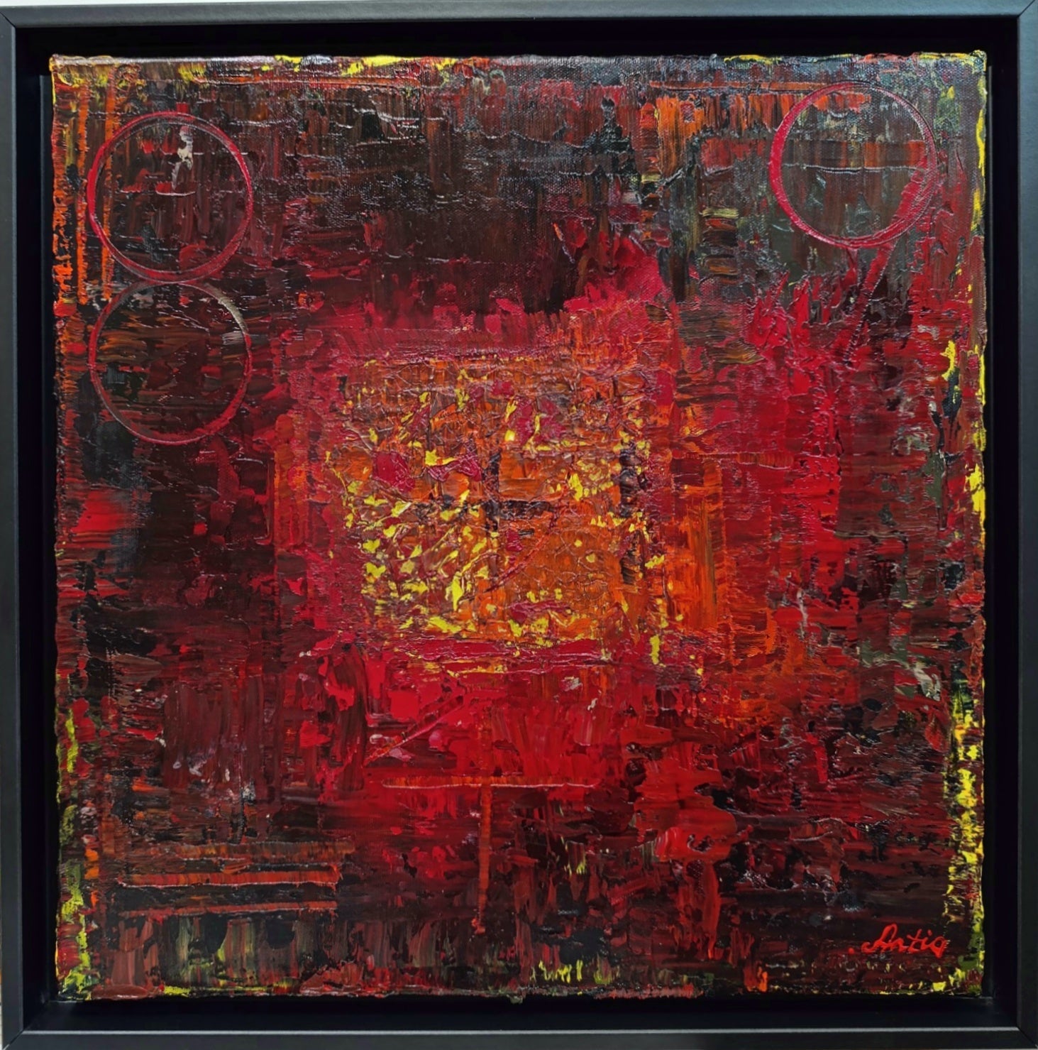 This composition dominated by intense shades of red, orange, and hints of yellow. The rich, textured surface of the painting reveals layers of impasto, creating depth and dimension. The use of vibrant colors is balanced by dark undertones, evoking a sense of warmth and mystery. Two subtle circular forms add geometric elements to the otherwise chaotic, expressive strokes, enhancing the painting's dynamic energy. The central square appears as a focal point, drawing the viewer's eye toward the center of the composition. The artist skillfully manipulates the paint to create a bold and powerful visual experience, with each layer contributing to the overall sense of movement and abstraction.