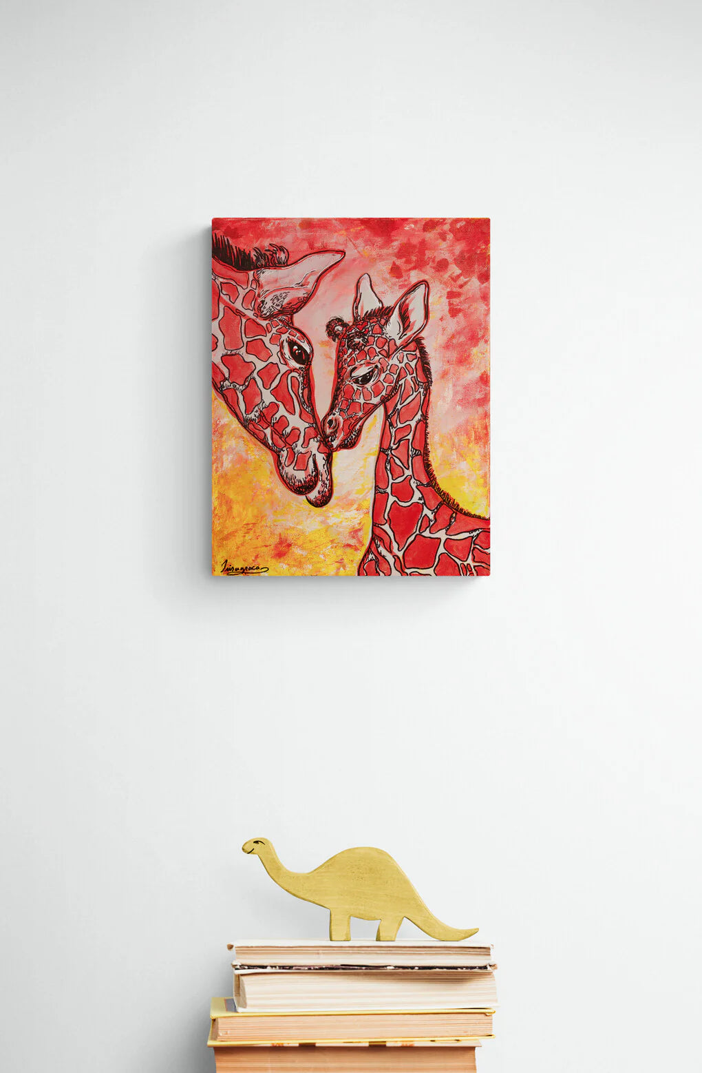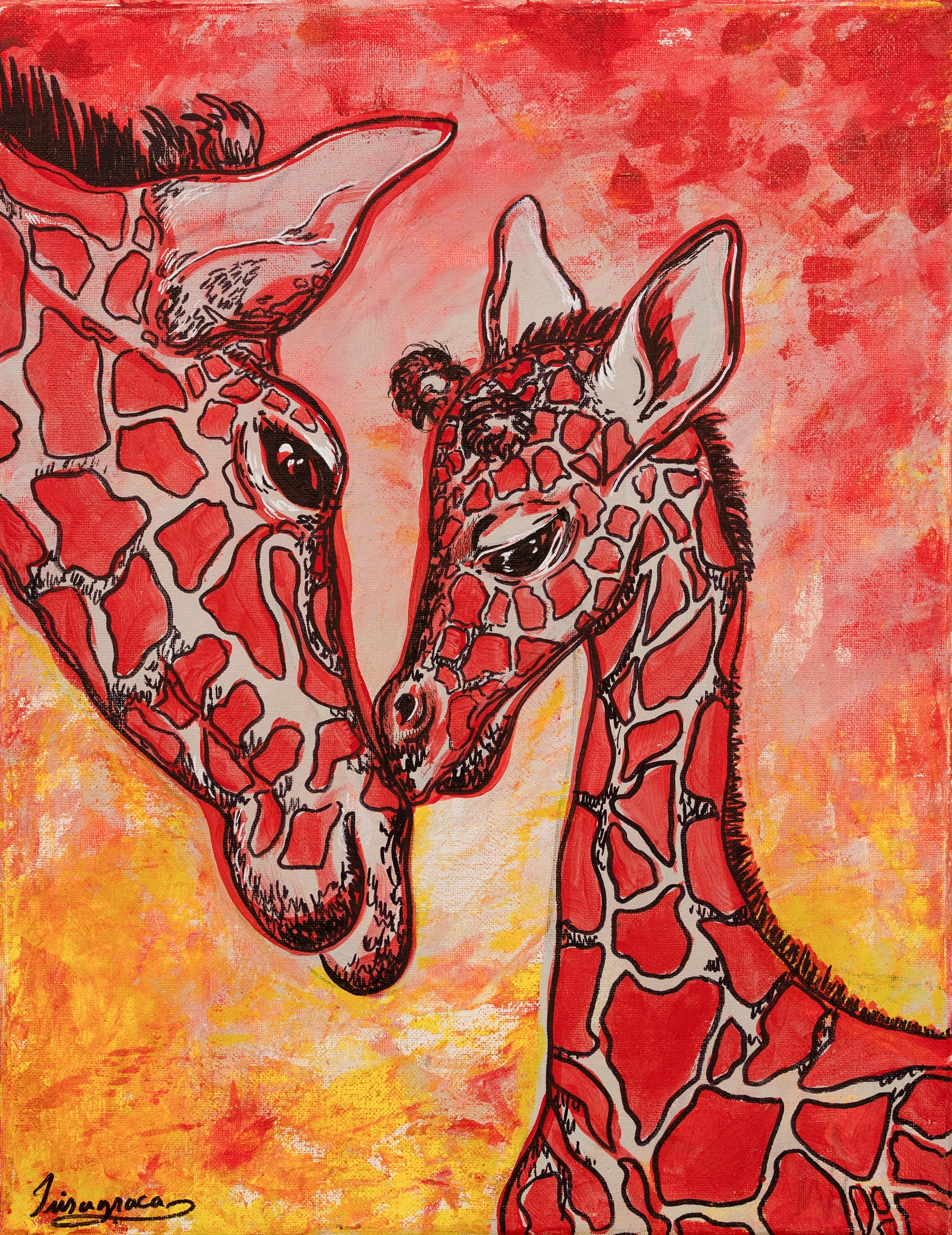 Two giraffes share a tender moment in this vibrant painting. The warm, fiery background contrasts beautifully with the detailed textures of the giraffes, highlighting their affectionate connection.