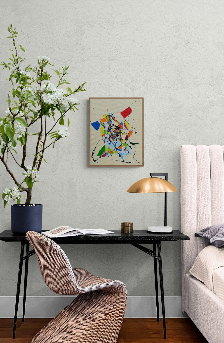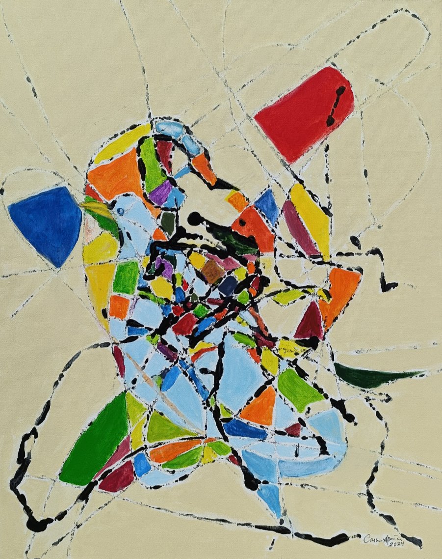 A vibrant and abstract piece where a mosaic of bold colors, intertwining in a web of black and white lines. The work is characterized by its fragmented shapes and dynamic motion, as if the colors are pulling and pushing against the boundaries. The composition feels spontaneous yet carefully constructed, capturing a sense of movement and energy. The use of bright, contrasting colors on a neutral background creates a striking visual effect, while the tangled lines suggest a chaotic yet unified form. This painting evokes a sense of abstract complexity and playful rhythm.