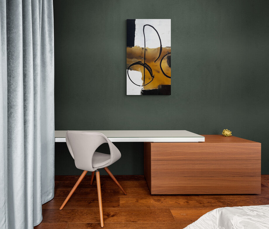 This abstract painting features bold, sweeping lines and shapes in black and earthy tones against a contrasting white background. The interplay of geometric forms and fluid lines creates a dynamic composition, evoking a sense of balance and movement. The simplicity and elegance of the design encourage viewers to find their own meaning and interpretation.