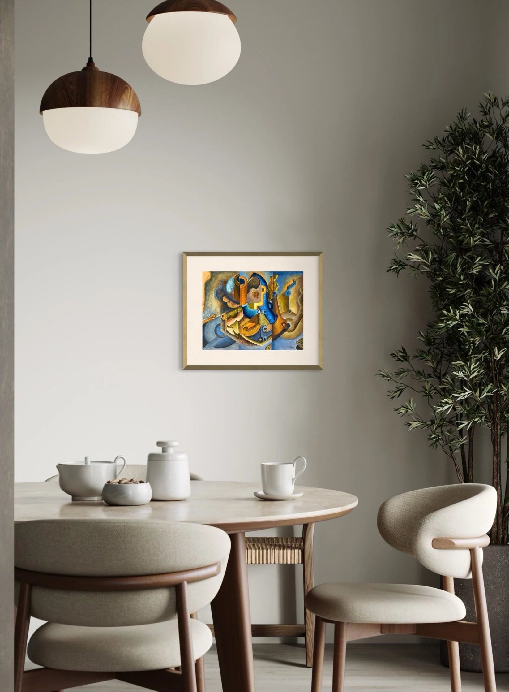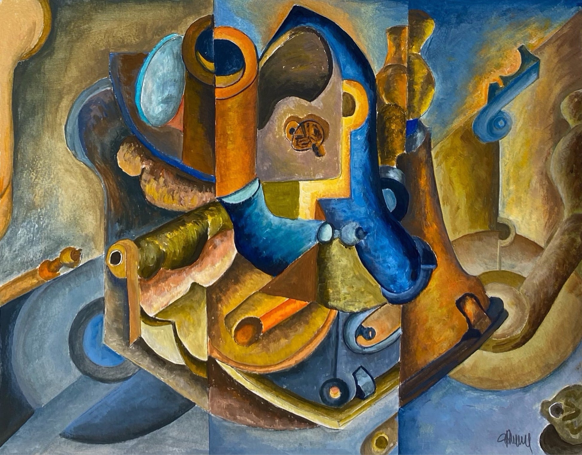 A dynamic exploration of industrial forms and complex structures, blending warm earth tones with cool blues and grays. The painting combines mechanical shapes and interlocking parts in a cubist-inspired composition, evoking a sense of organized chaos. The juxtaposition of circular and angular forms, alongside the interplay of light and shadow, suggests movement and mechanical functionality within a surreal landscape. This piece invites the viewer to delve into an imaginative, almost futuristic world where the boundaries between organic and mechanical forms blur.