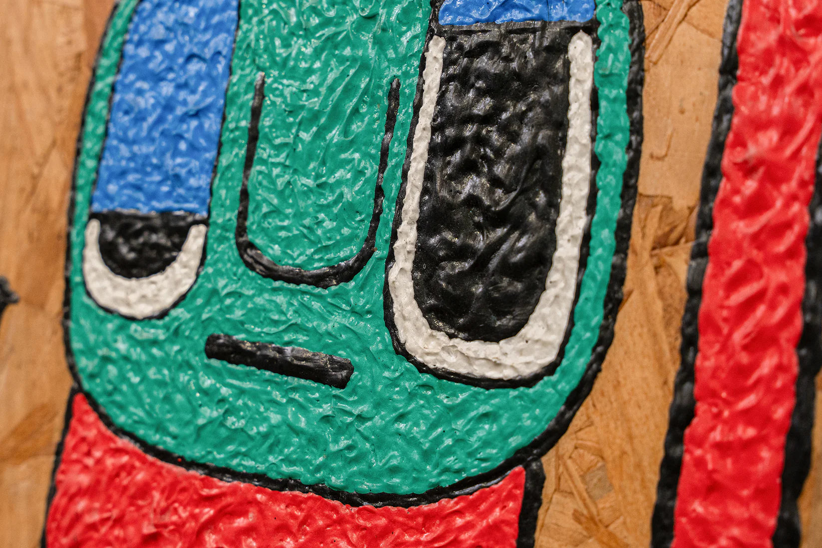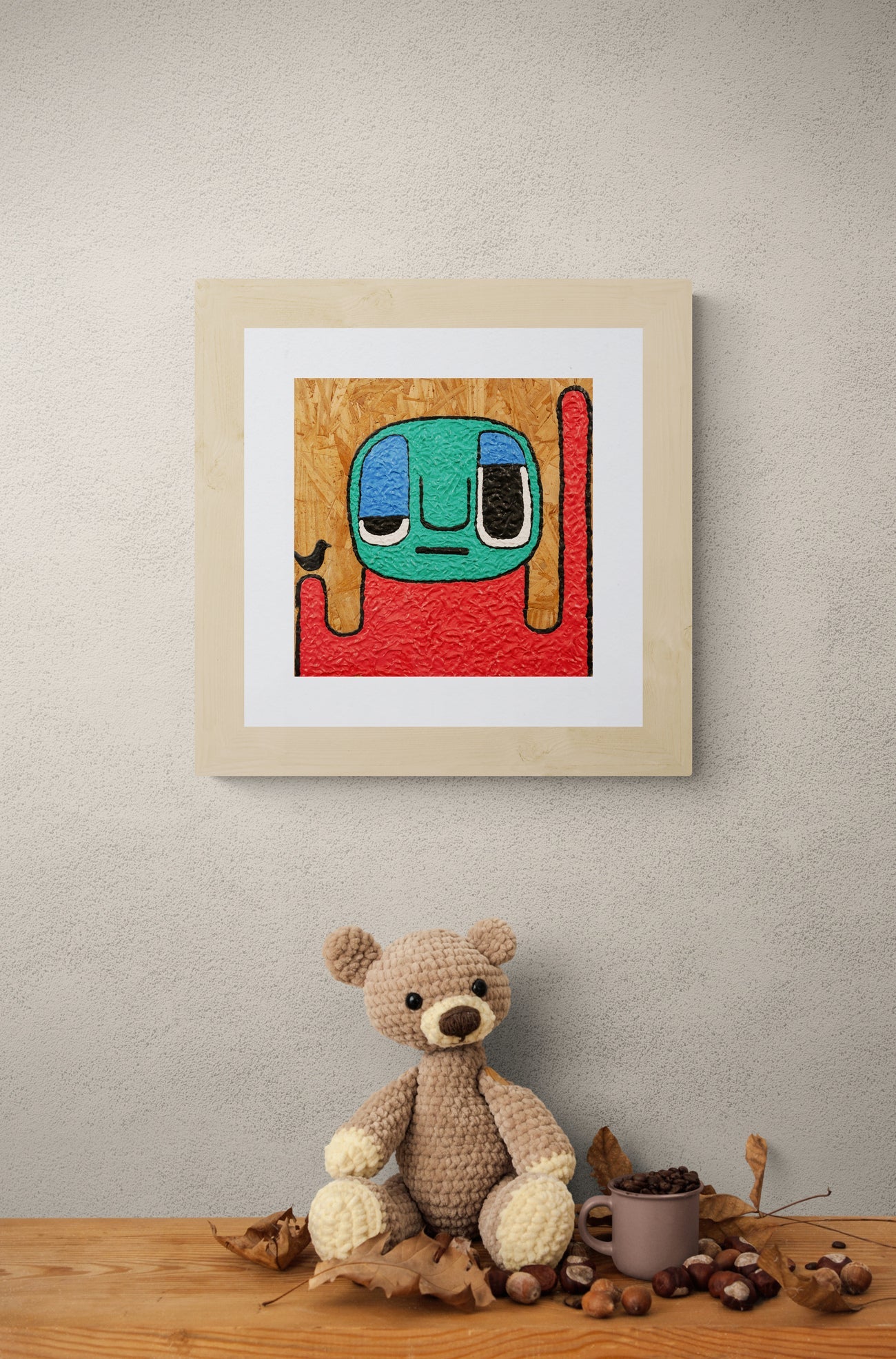 A whimsically abstract character with large blue eyes and a contemplative expression sits against a textured background of earthy tones.