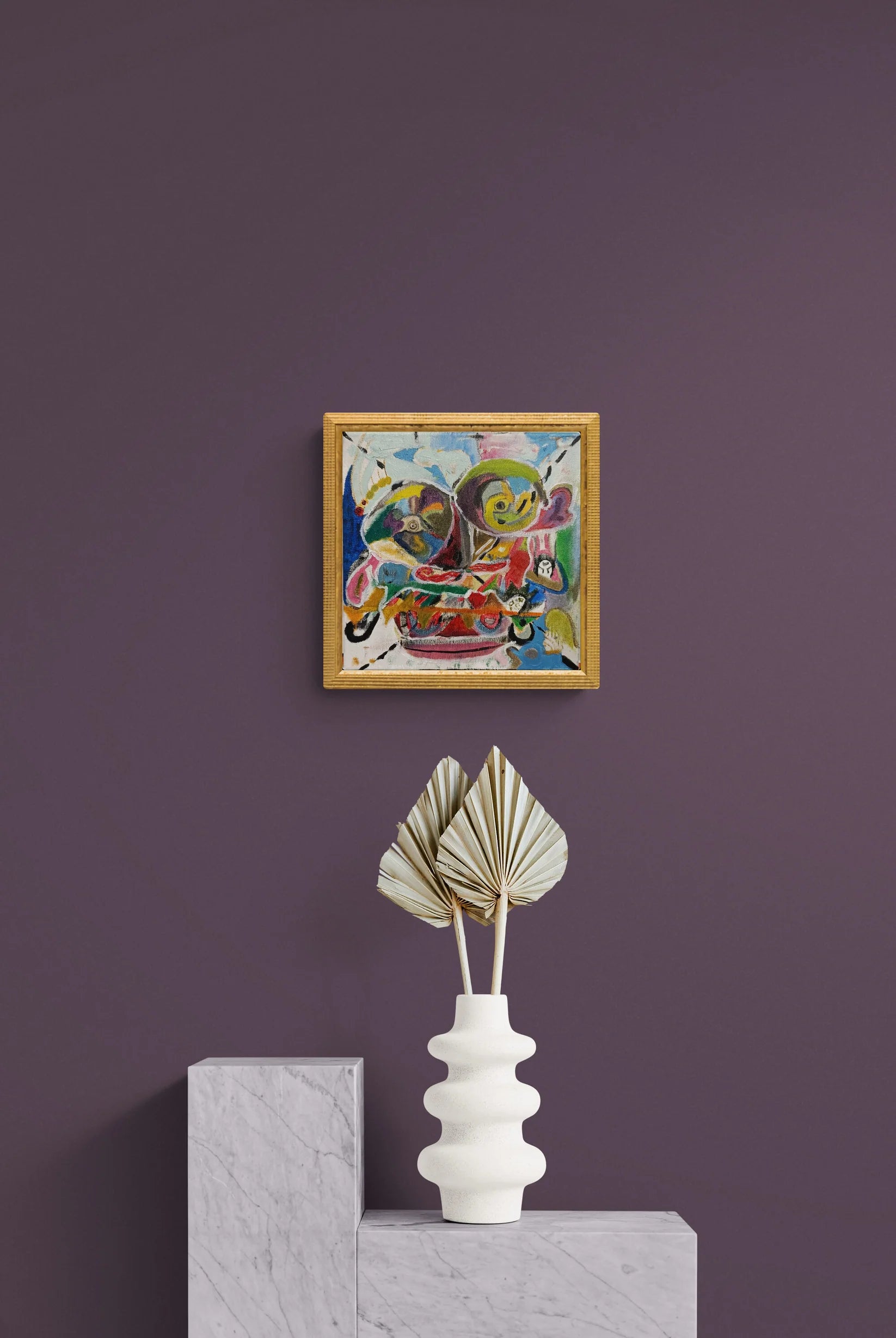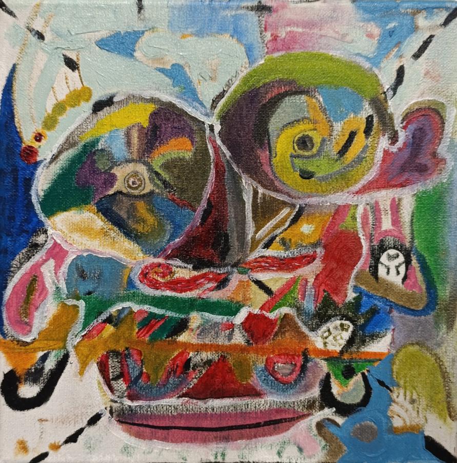 The painting that bursts with color and playful shapes, inviting the viewer into a dreamlike universe. The vibrant mix of bold greens, blues, yellows, and pinks swirls together, creating dynamic forms that seem to evolve as you look closer. The piece features overlapping figures and objects, blurring the lines between reality and imagination. The joyful chaos of this painting encourages exploration, with each glance revealing new details hidden within the abstract composition. "Whimsical Worlds" is a celebration of creativity, movement, and the limitless possibilities of artistic expression.