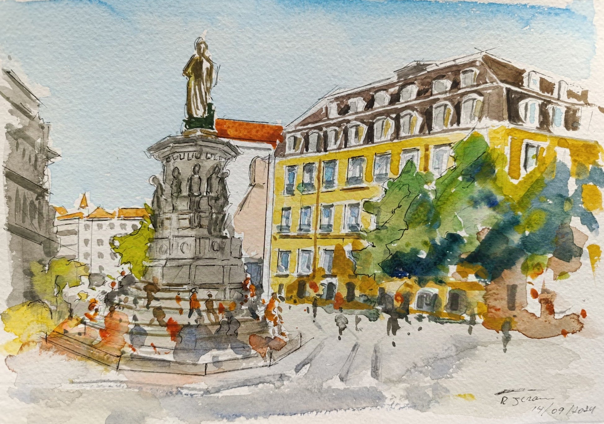 This watercolor illustrating a bustling city square, complete with the striking monument of a historical figure standing majestically at its center. The artist skillfully employs a loose, expressive style to bring the scene to life, allowing the vivid colors and fluid strokes to evoke a sense of movement and the liveliness of an urban afternoon. This painting captures the architectural beauty and dynamic atmosphere of the cityscape, making it a captivating addition to any collection.