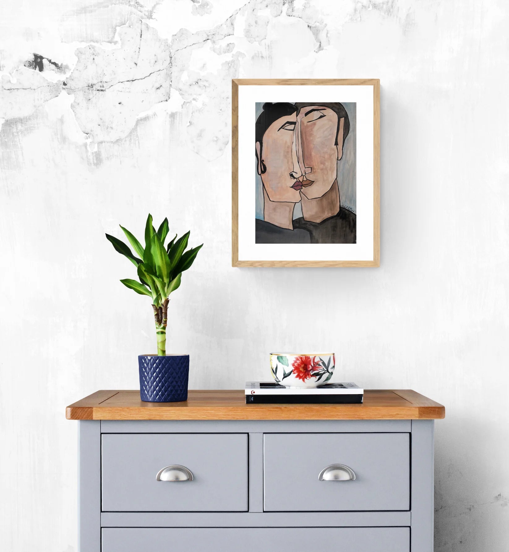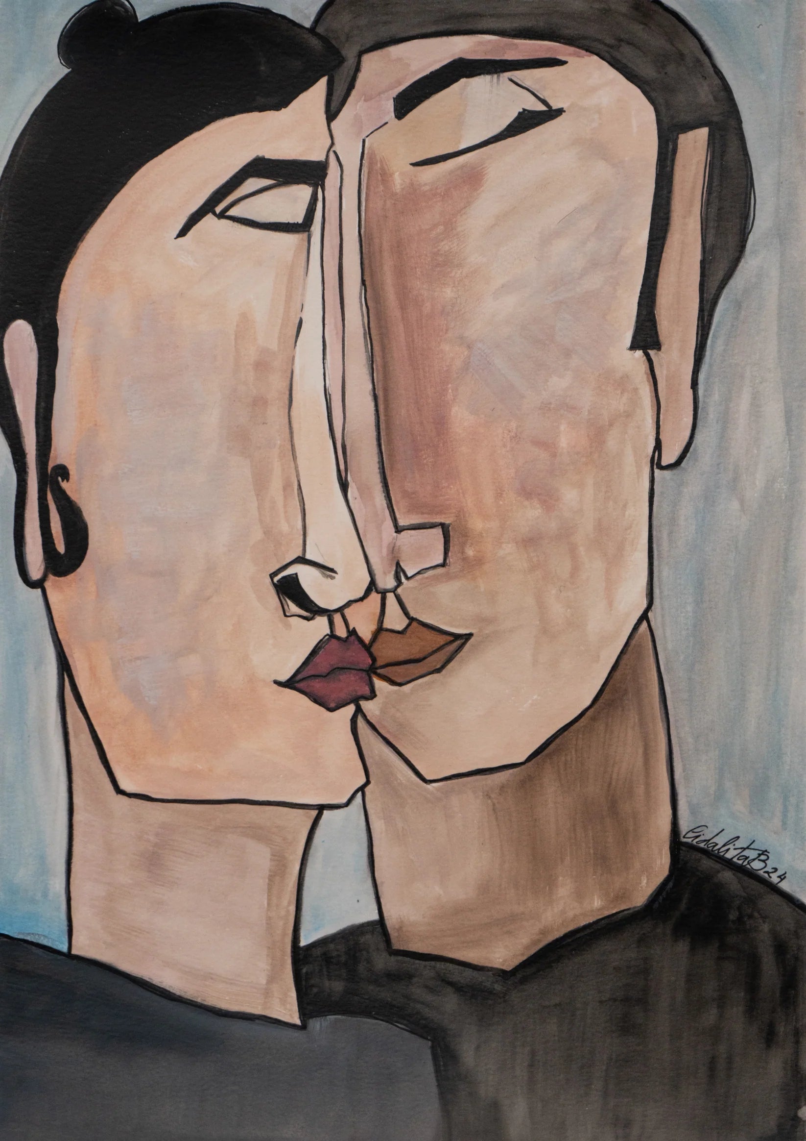 "Metamorfose" portrays the close-up moment of two stylized faces nearing a kiss. Their simplified yet expressive features, highlighted with bold contours and subtle color shifts, evoke a deep emotional connection and intimacy. The use of minimalistic style focuses on the raw emotions shared between the pair, making it a powerful representation of love and human connection.