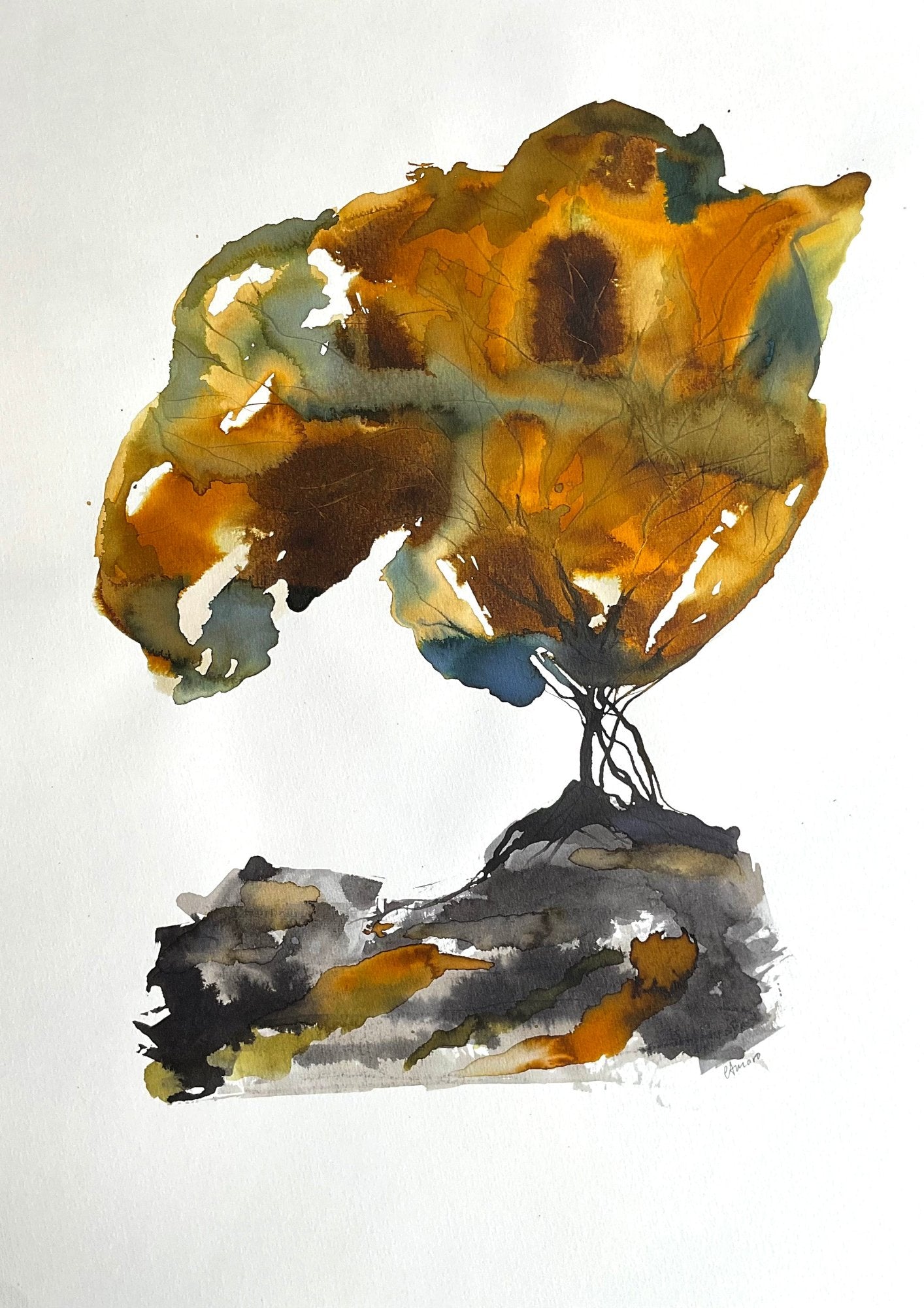 The use of watercolors adds fluidity, allowing the colors to merge naturally, mimicking the unpredictability and resilience of an old tree shaped by time and the elements. The fine, delicate branches reach out like veins, symbolizing the endurance and life force of the tree, this watercolor piece on high-quality 300 gsm paper brings forth an organic aesthetic with minimalist undertones, embodies a connection to nature's history and strength, evoking a sense of calm and reverence for the timeless beauty found in trees and landscapes.