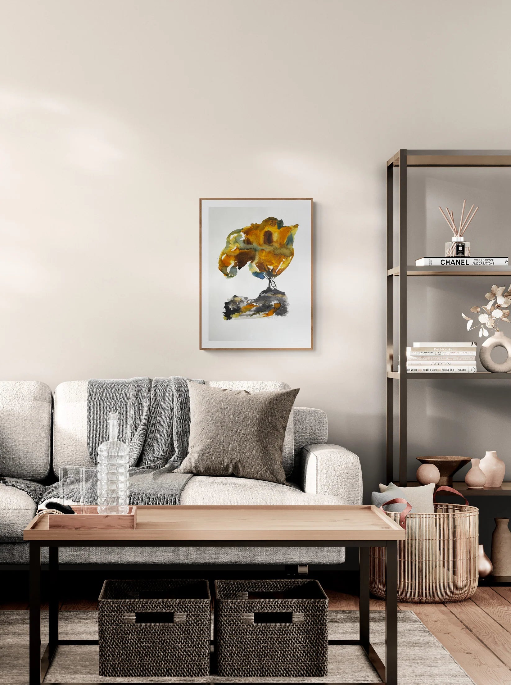 This artwork from the Trees series, beautifully captures the essence of nature through a minimalistic yet expressive approach. The piece uses warm, earthy tones of amber, ochre, and hints of deep green, creating an organic and weathered look.