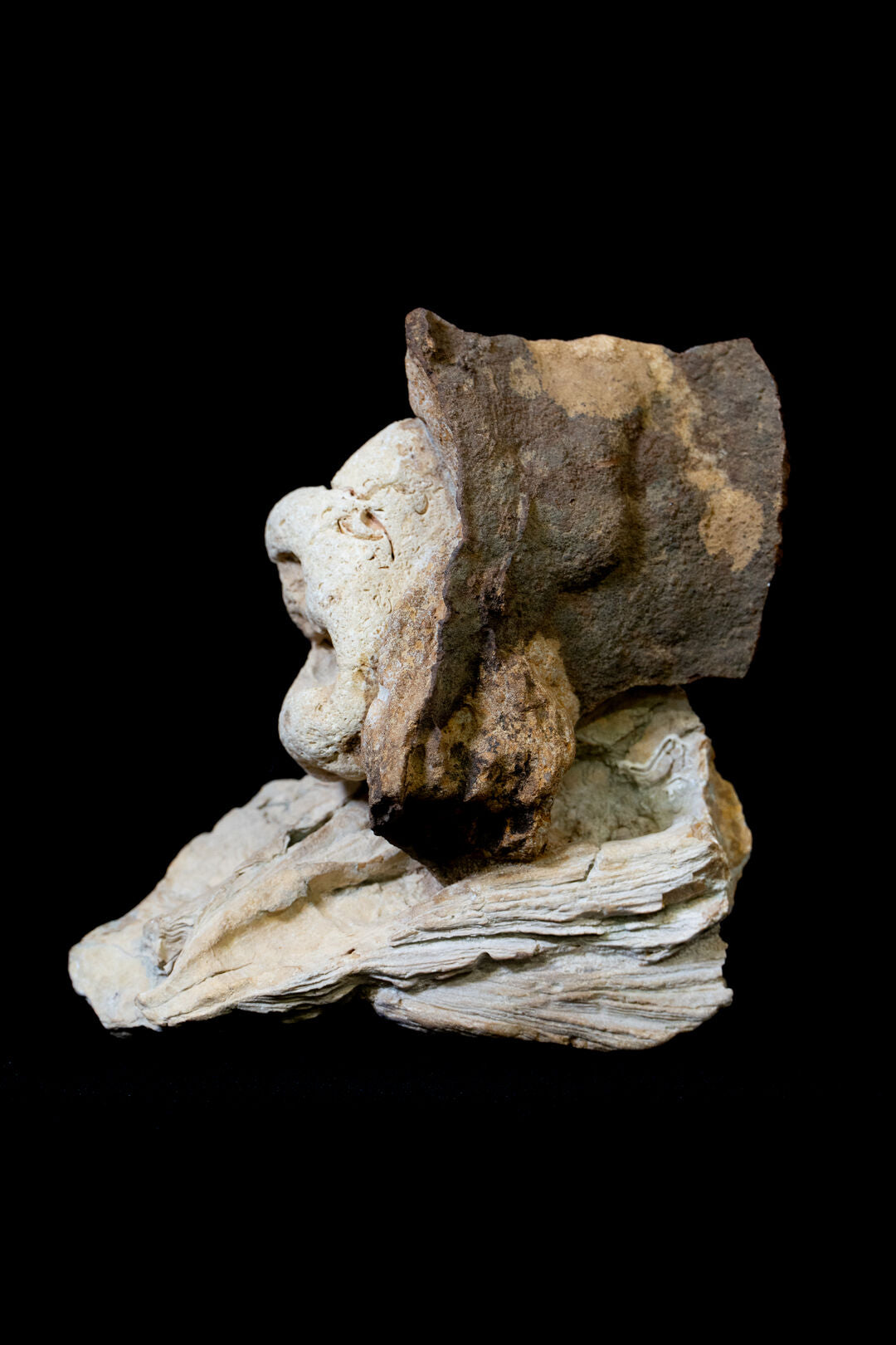 A stone sculpture that seems to emerge from the earth itself, depicting a weathered face with features carved by time. The textured, layered stones evoke the impression of a figure formed by natural forces, embodying a sense of resilience and timeless presence. The profile, with deep-set features and a contemplative expression, suggests a sage or elder, holding a quiet, stoic wisdom shaped by the ages. This piece resonates with themes of endurance and the beauty of natural imperfections, inviting viewers to reflect on the strength and history embedded in nature.