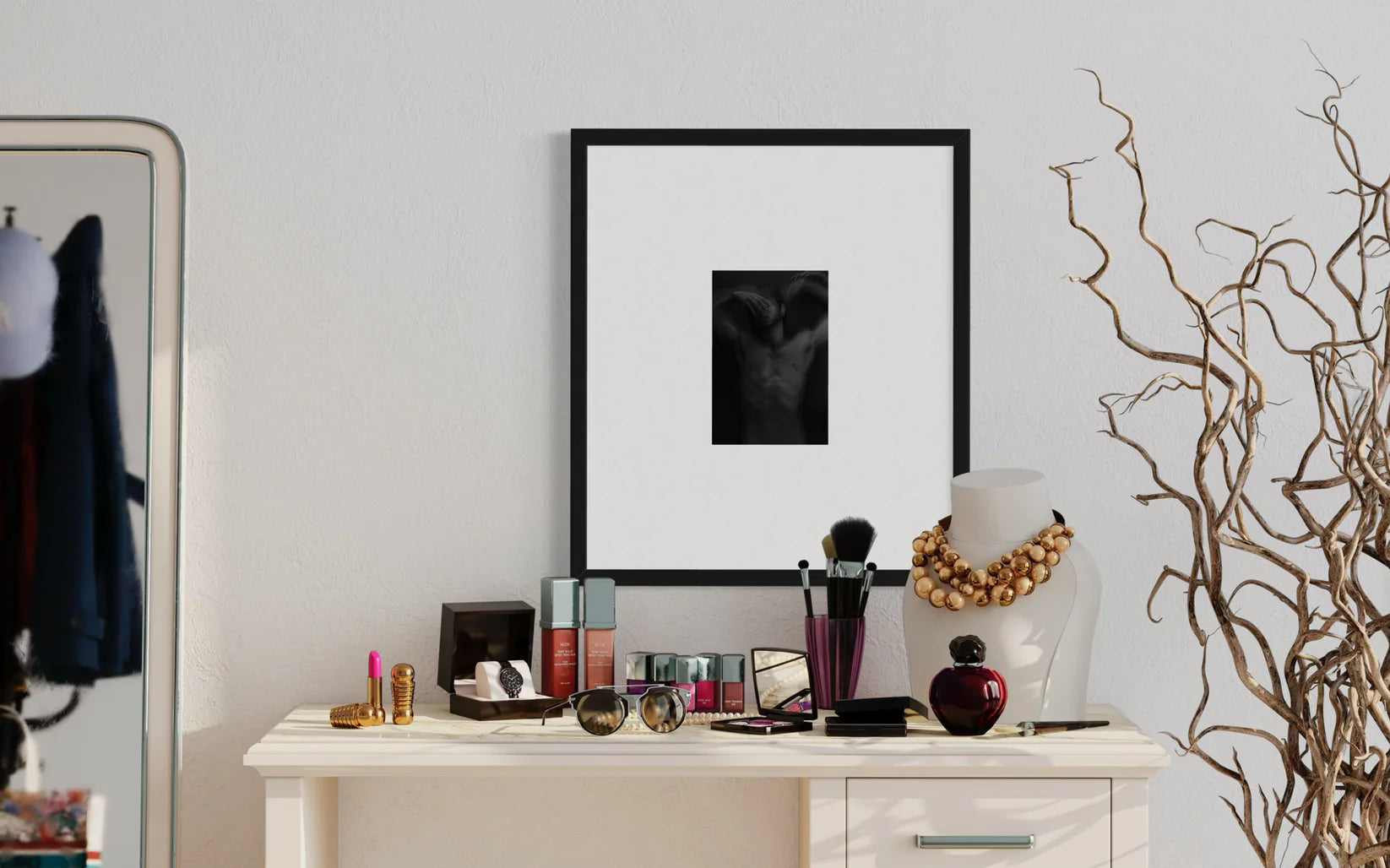 In this black-and-white photograph by Duda Breda, a nude male figure stretches across a dark backdrop, his arms raised overhead as one hand veils his eyes. The subtle motion blur envelops his torso and arms, creating a ghostly sense of fluidity. This visual distortion accentuates the tension between the subject’s physical form—rendered in dramatic tonal contrasts—and the introspective state suggested by his obscured gaze.