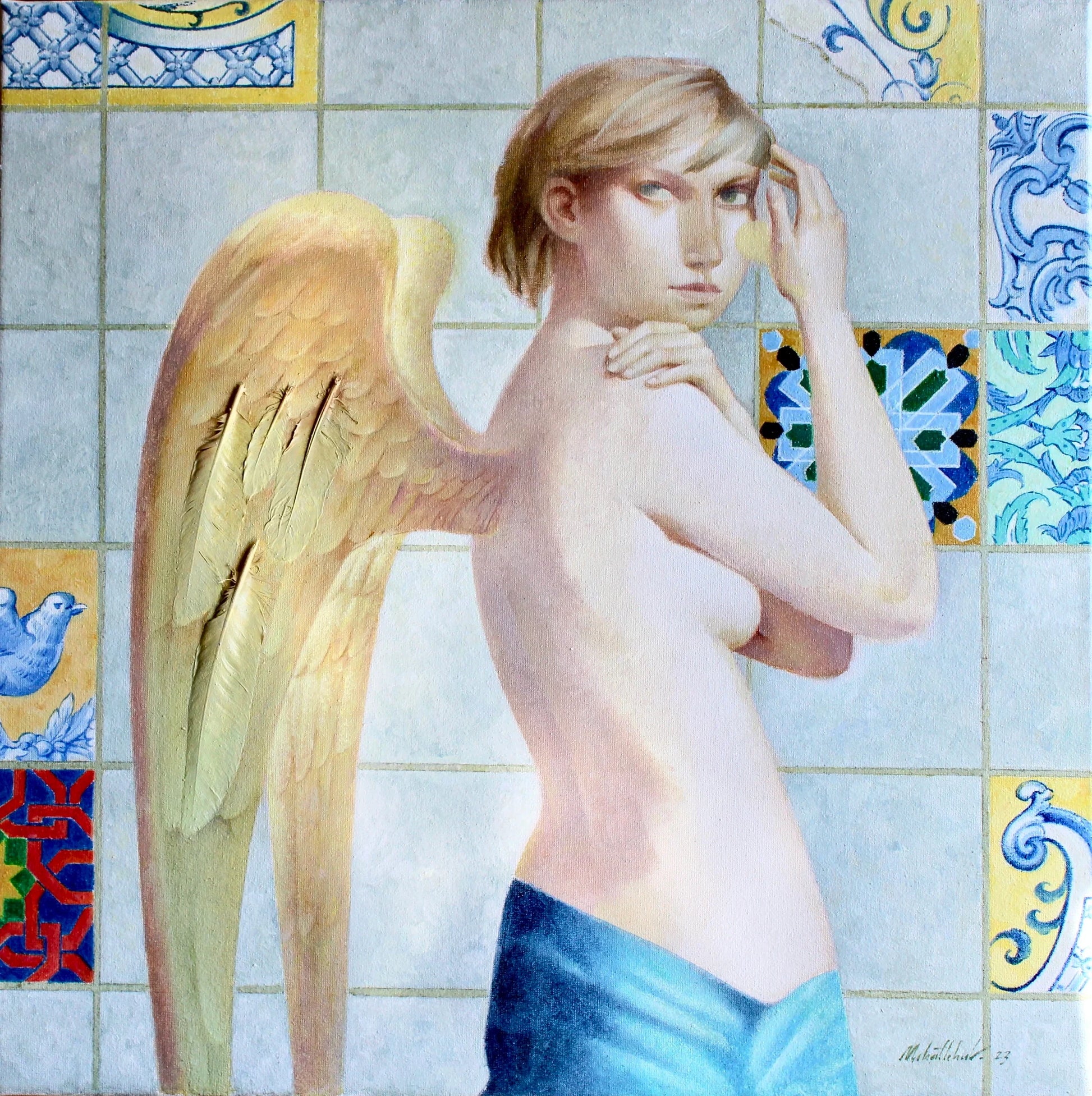 The detailed, lifelike rendering of the figure, combined with the fantastical element of wings, is characteristic of Magical Realism. The careful attention to the texture of the skin, the fabric, and the feathers contrasts with the surreal nature of a human with angel wings, merging the realms of the real and the imaginary.