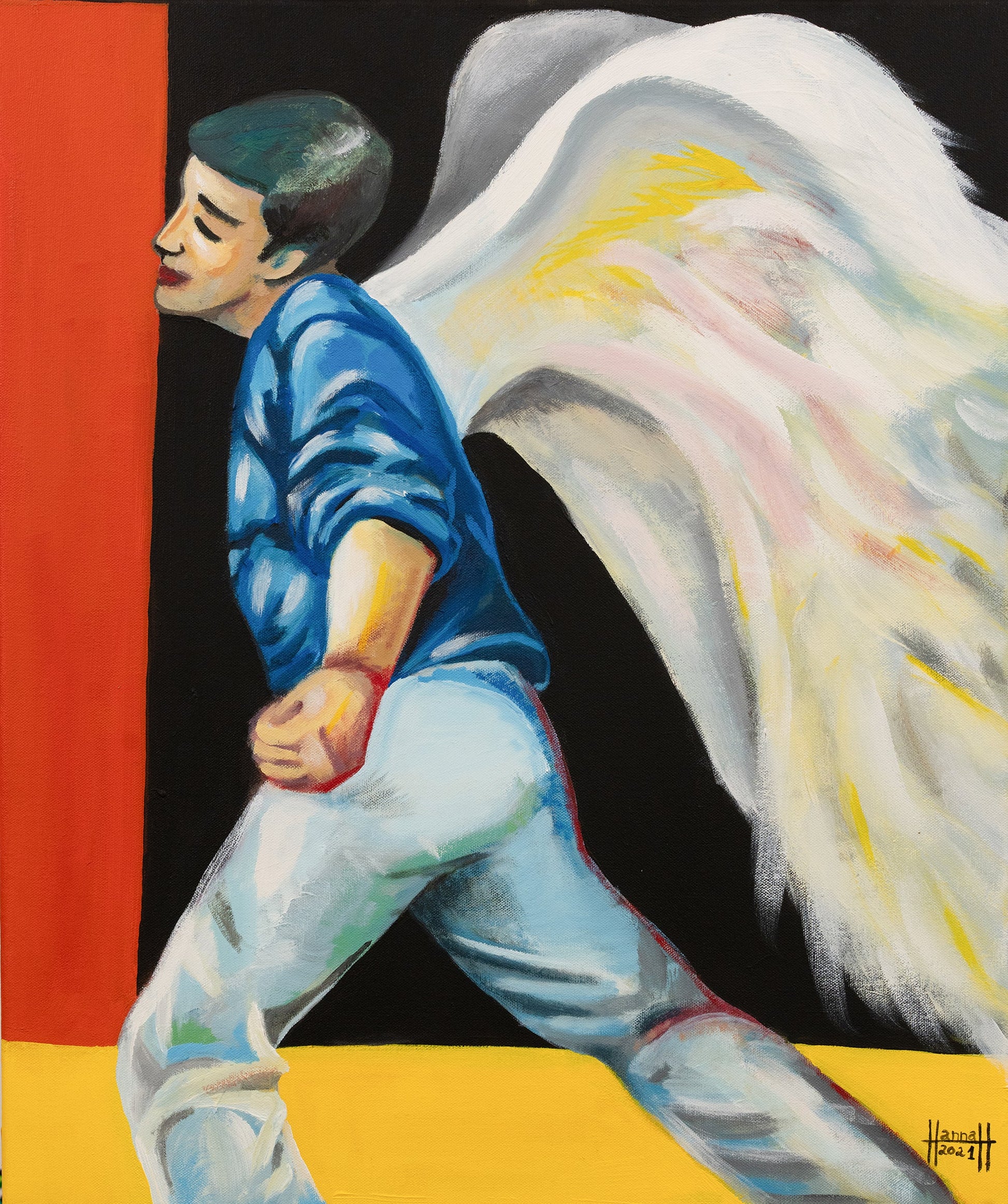 A striking portrayal of a figure with angelic wings, caught in motion. The bold contrast between the figure and the background highlights the sense of movement and the ethereal quality of the wings.