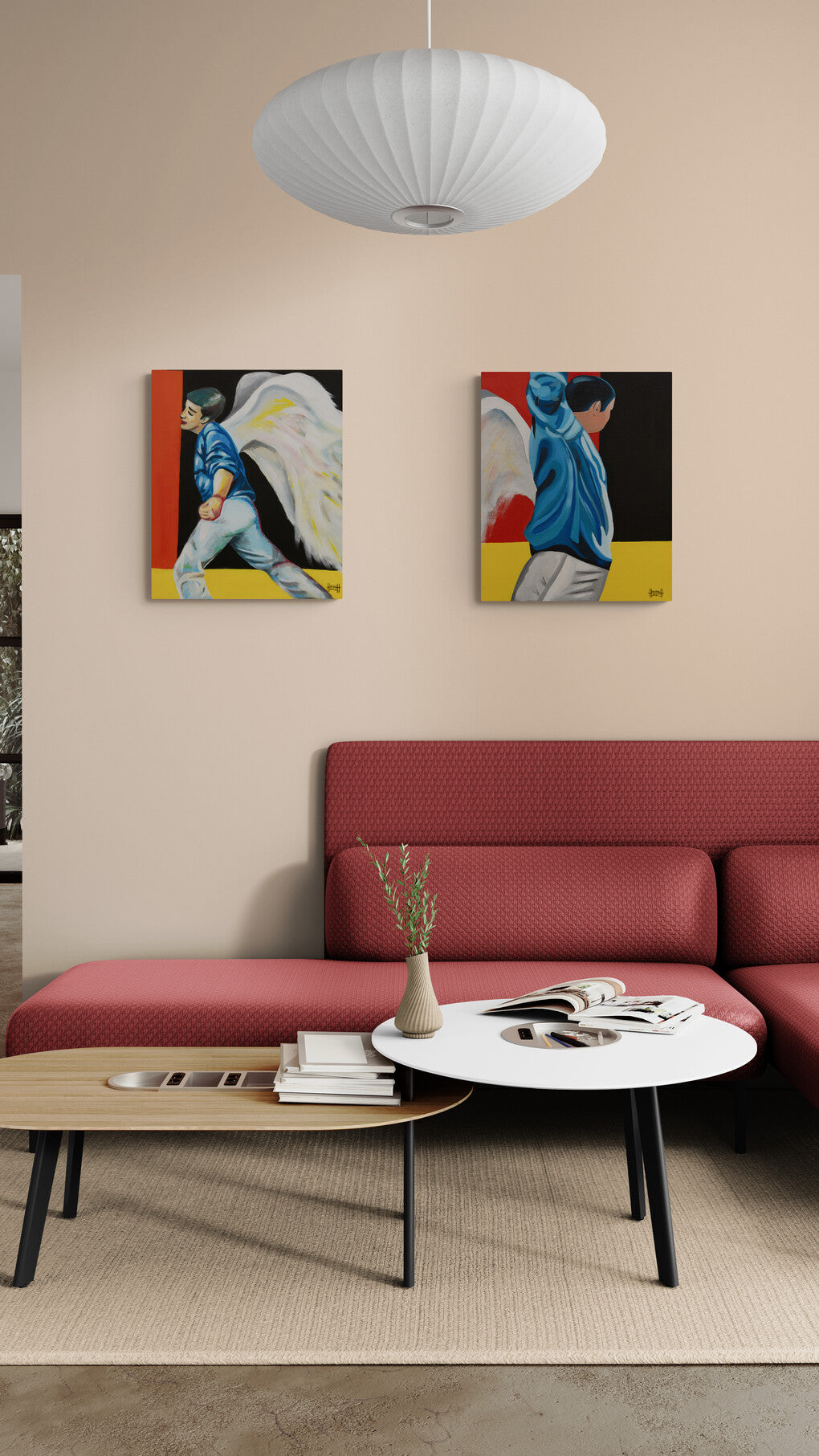 A powerful depiction of a figure in mid-motion, adorned with angelic wings. The bold, contrasting colors and dynamic composition convey a sense of freedom and aspiration.