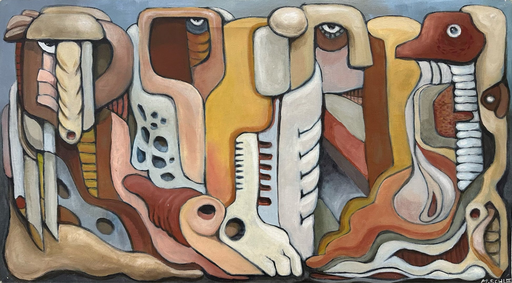 A surreal composition featuring ambiguous, part-human and part-architectural forms rendered in warm, earthy tones, creating a layered, dreamlike tableau.