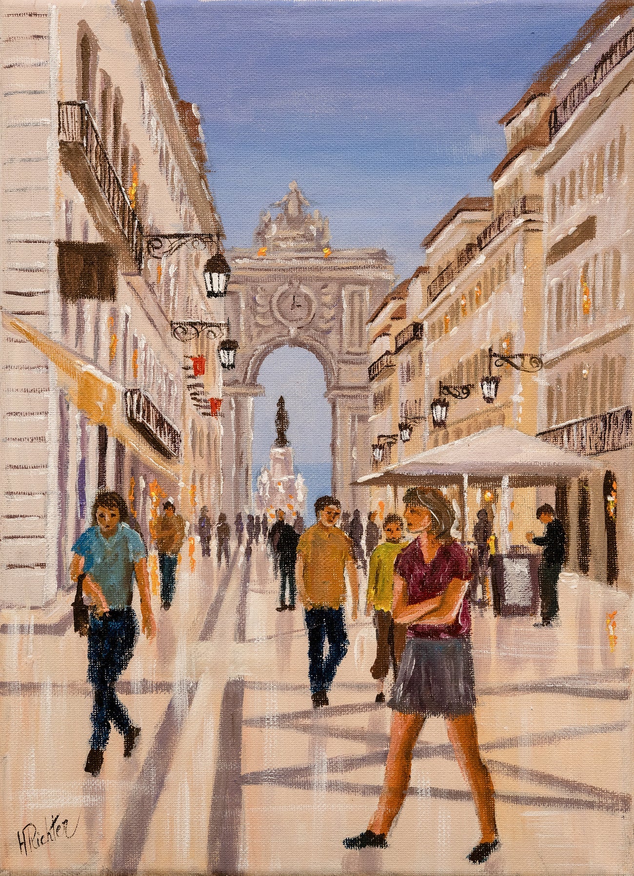 A lively promenade leads towards a majestic arch, where figures stroll and mingle under the warm glow of street lamps, the air filled with a sense of leisure and history.