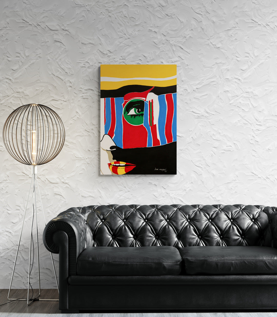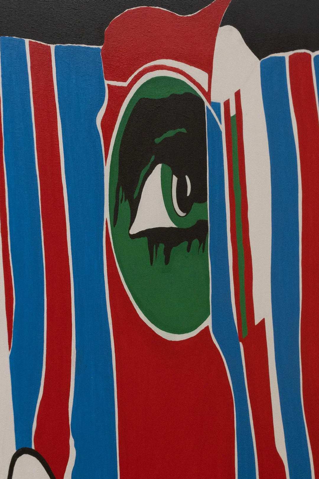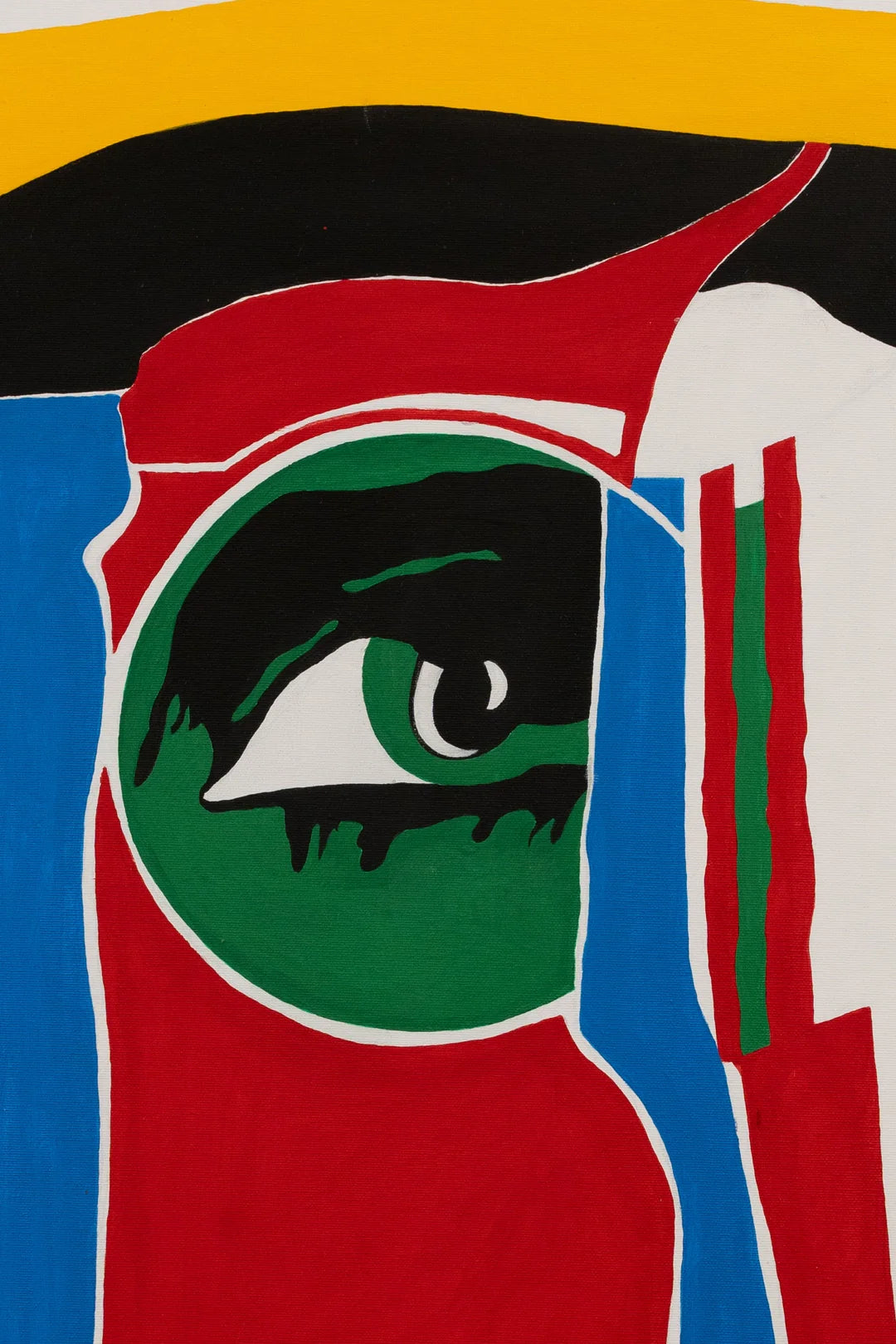 This painting by José Cardoso, features a stylized portrait composed of bold, flat colors and black outlines reminiscent of Pop Art.