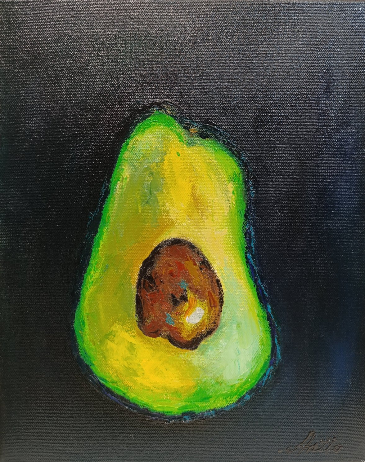 This piece presents a striking depiction of a halved avocado, glowing with vibrant greens and yellows, set against a dark, minimalist background. The artist emphasizes the avocado’s natural textures, from the smoothness of the fruit’s flesh to the rougher, dimpled texture of the seed, using bold brushstrokes to create dimension. The contrast between the bright avocado and the dark background highlights the simplicity of the subject, making it almost surreal and inviting viewers to appreciate the beauty in everyday objects. The use of light and color lends a sense of freshness, almost as though the avocado were illuminated from within.