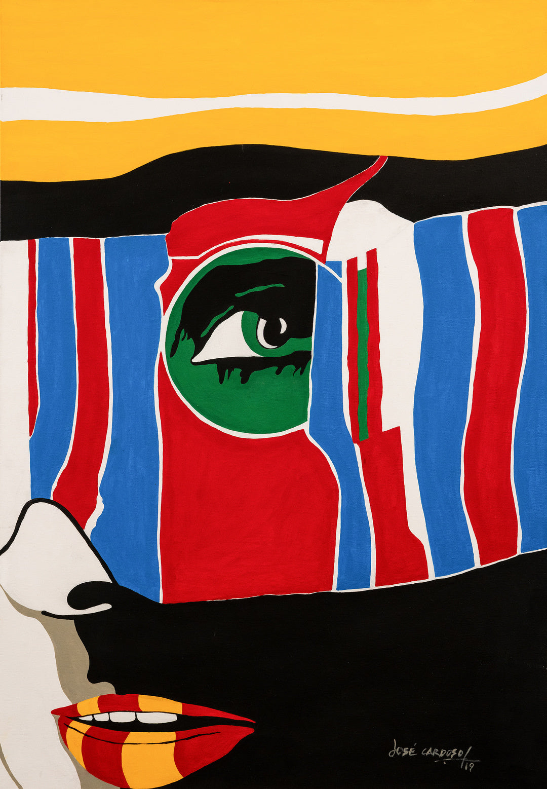This painting by José Cardoso, features a stylized portrait composed of bold, flat colors and black outlines reminiscent of Pop Art.