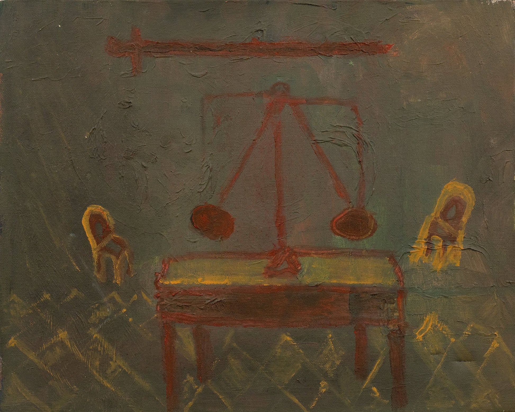 This abstract painting features a stylized balance scale placed on a table, flanked by two chairs. The muted colors and rough textures evoke a sense of contemplation and equilibrium, inviting viewers to ponder the delicate balance of life and justice.