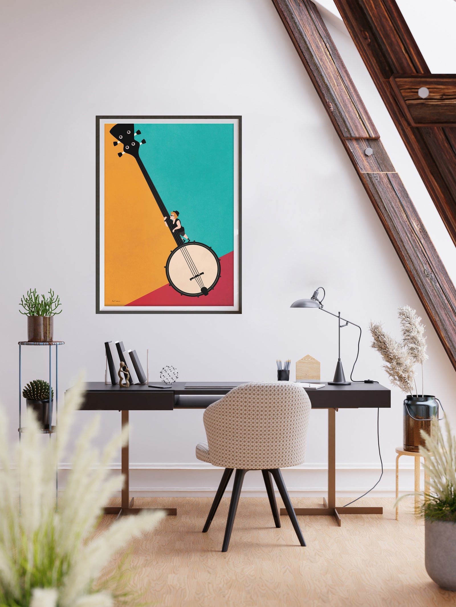 The minimalist design and strong color contrasts emphasize the power and joy of brass instruments.