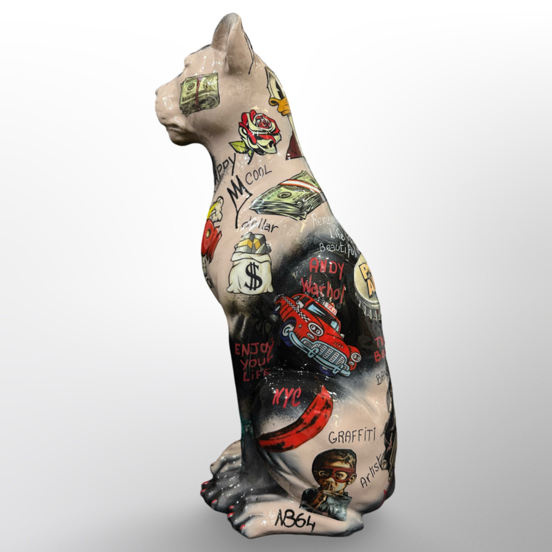 A bold and contemporary sculpture of a sitting panther, vividly decorated with iconic pop art imagery, graffiti elements, currency symbols, playful cartoons, and street culture motifs.