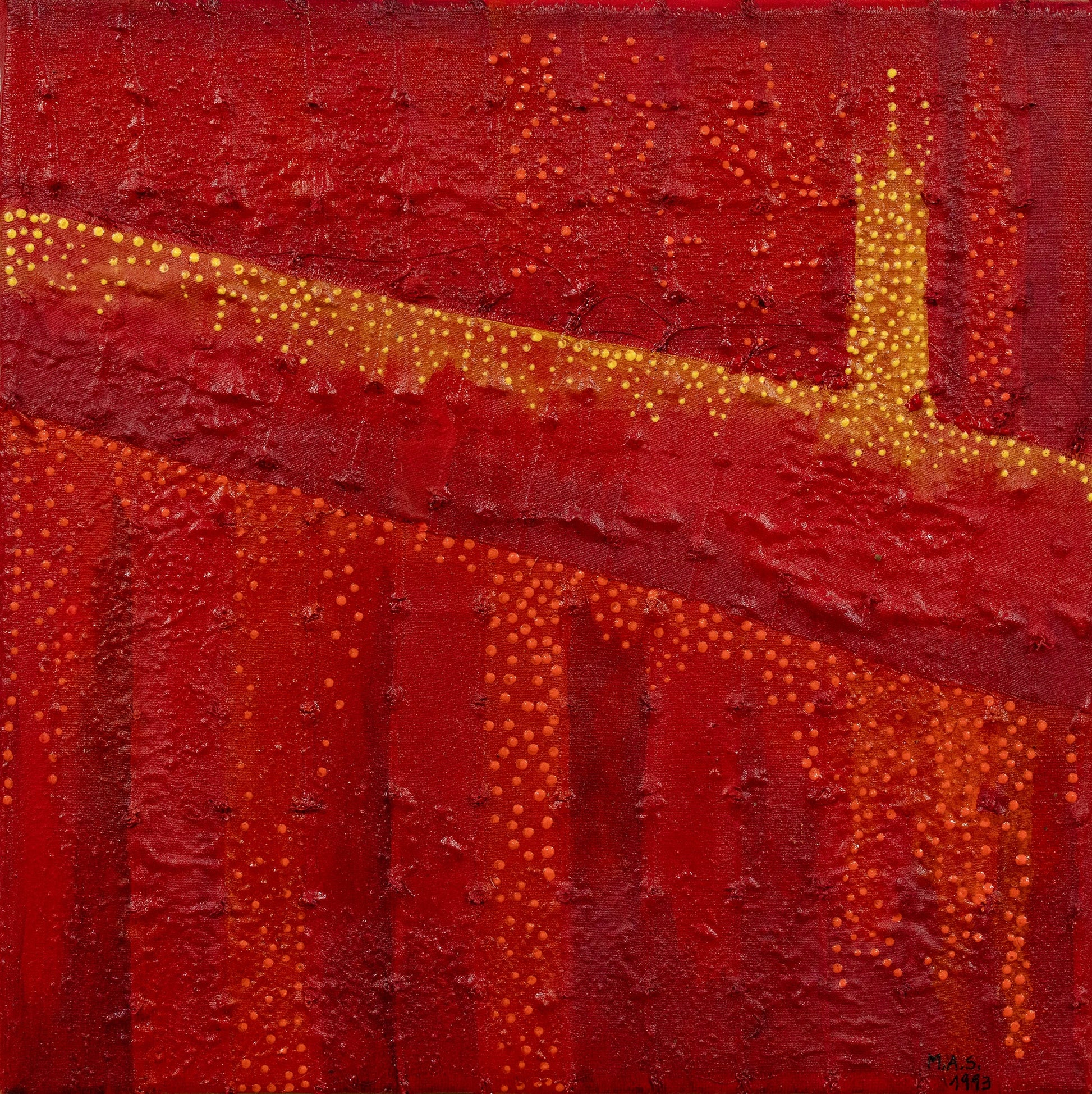 abstract piece that explores the dynamic interplay of red hues and geometric shapes. The textured surface and vibrant color palette create a sense of depth and movement, making this painting a striking focal point in any space.
