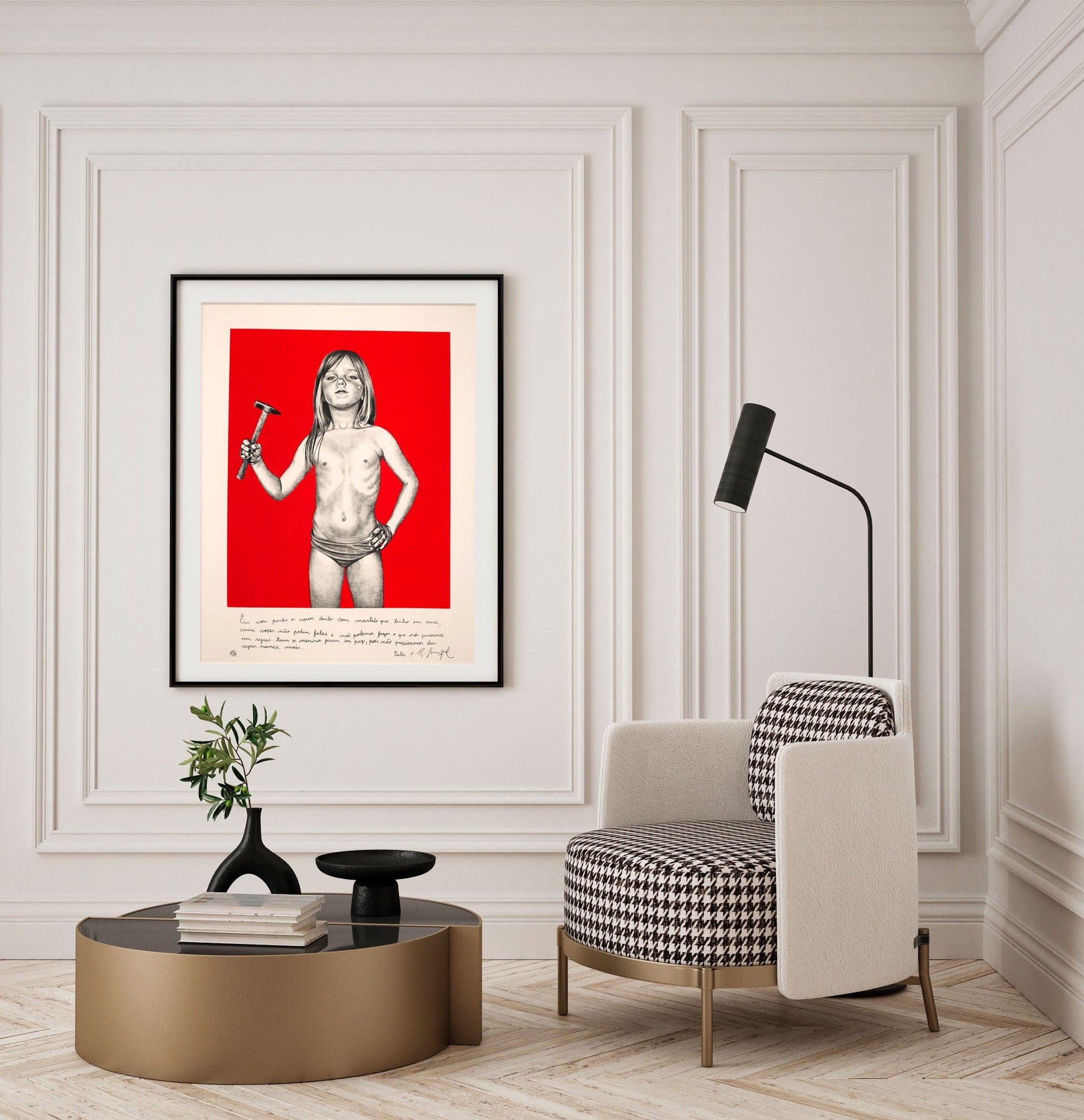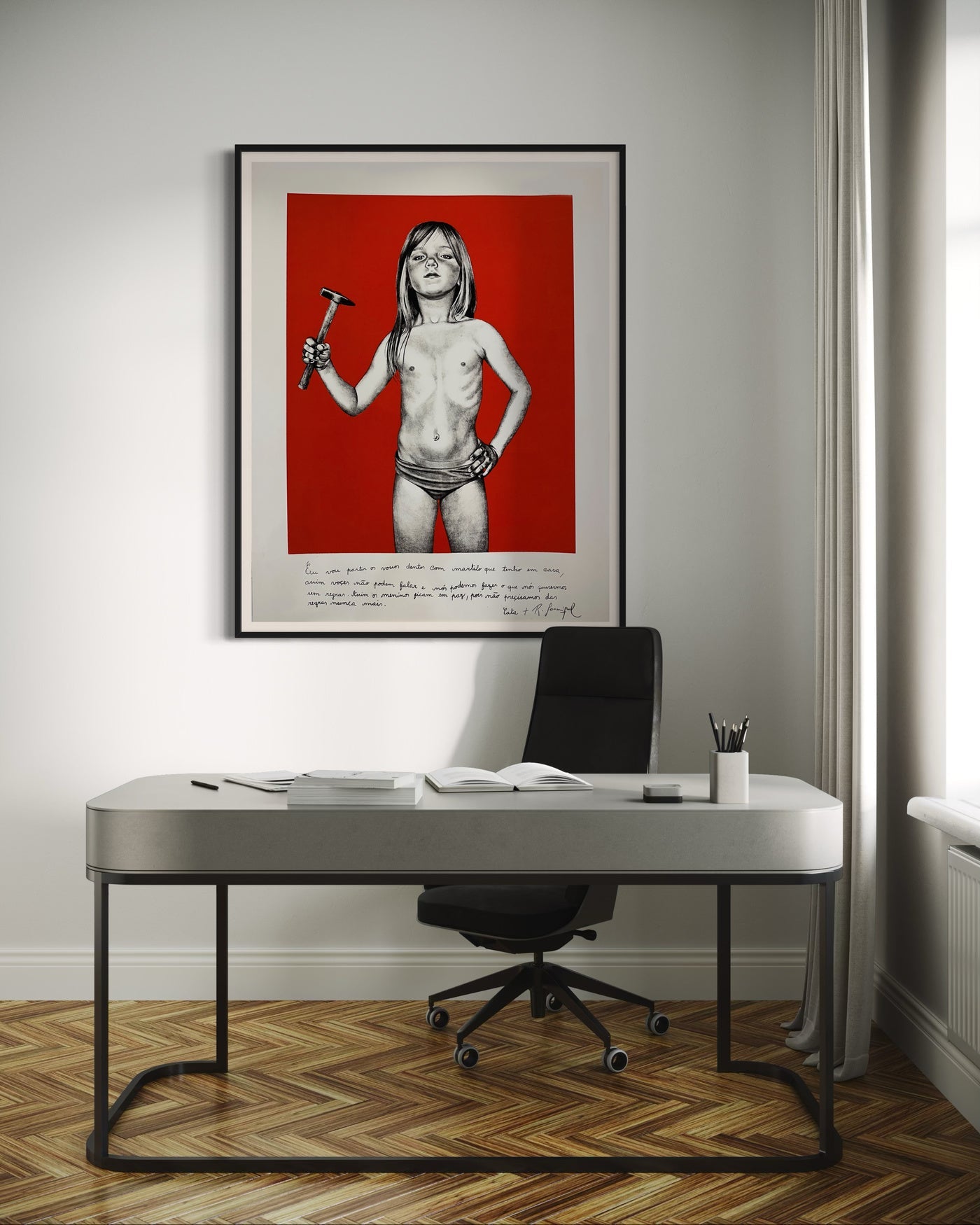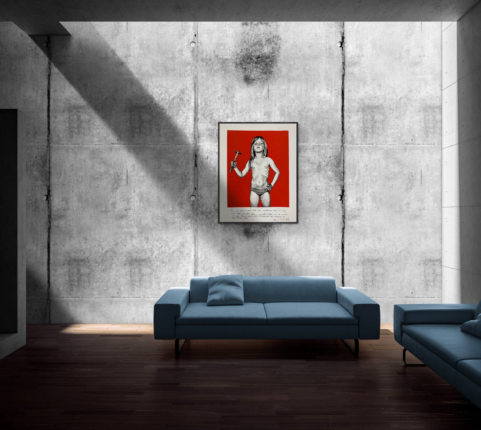 The realistic portrayal of the child, especially with the addition of a hammer, creates a narrative or symbolic depth that is often explored in modern and contemporary art.