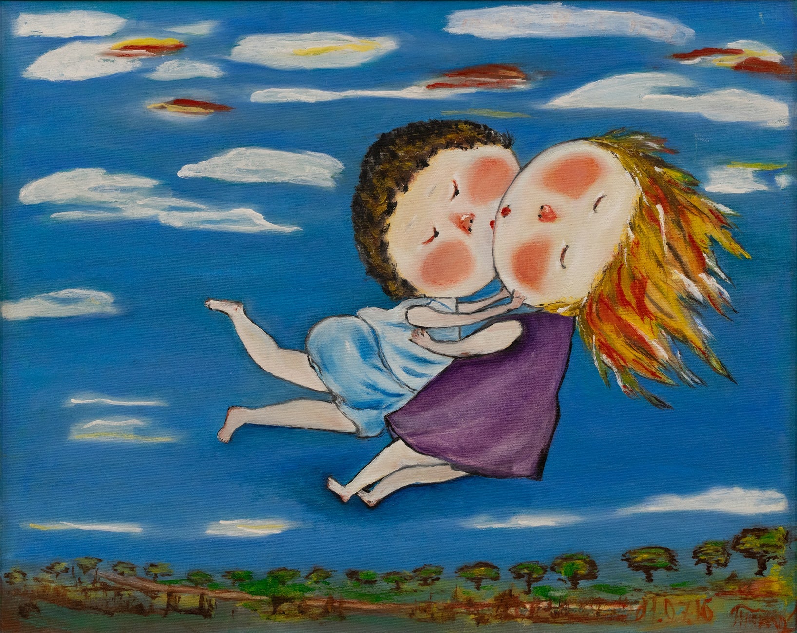 Two stylized children float in a dreamy sky, their cheeks rosy with affection as they share a tender, innocent kiss. Below them, a serene landscape stretches into the distance under a canopy of white clouds.
