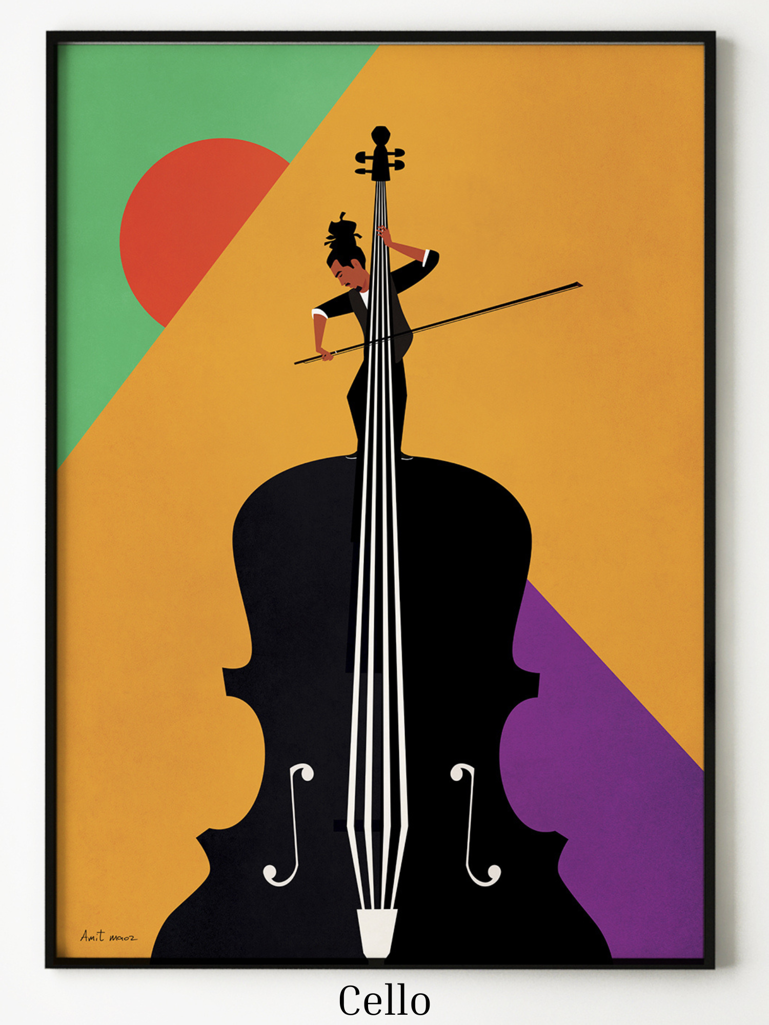 A modern, minimalist artwork depicting a musician gracefully playing a cello that seamlessly merges with the instrument’s silhouette. The bold use of geometric shapes and vibrant colors like orange, green, and purple contrasts with the black cello form, creating a dynamic yet elegant composition.
