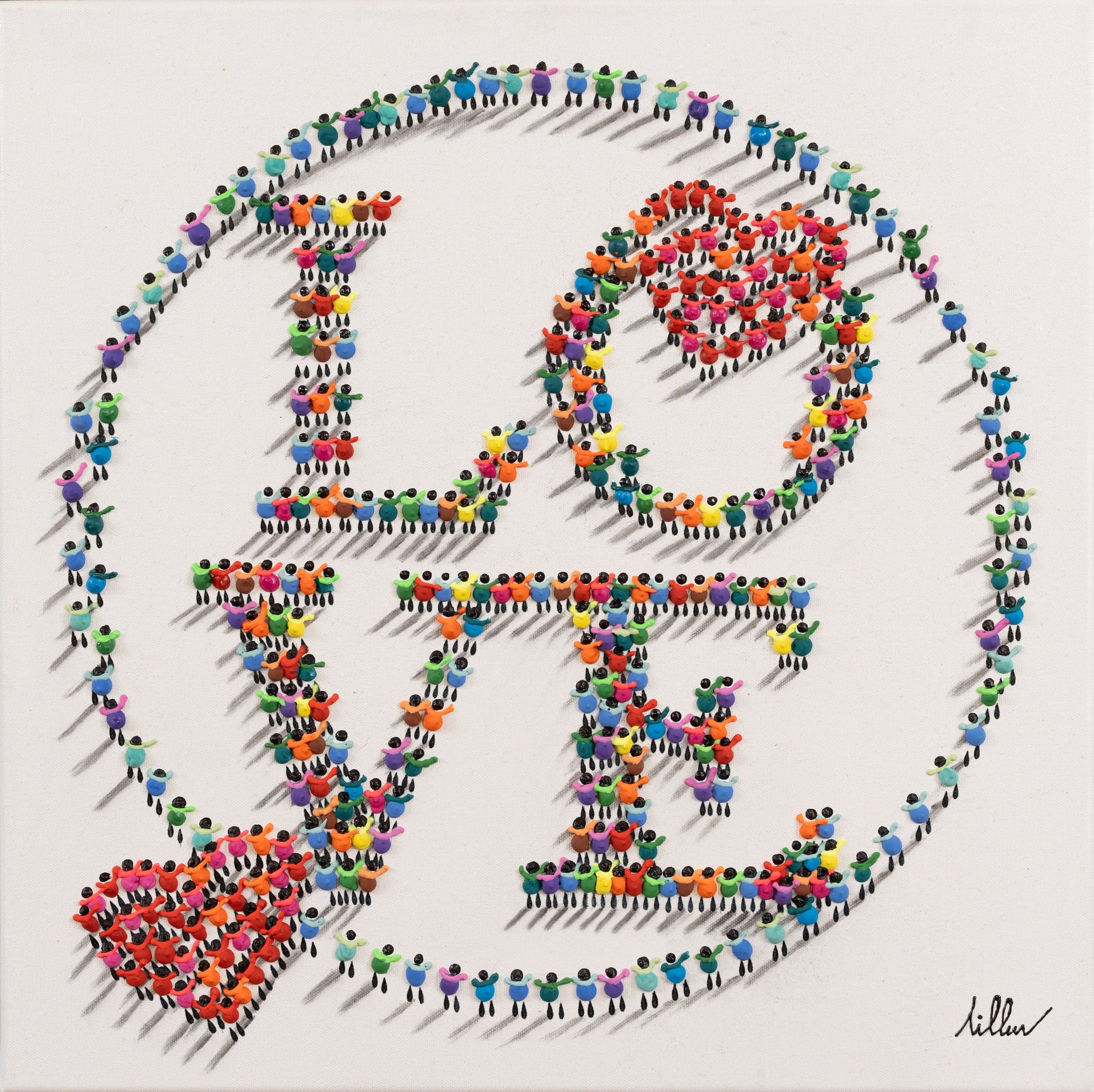 This playful and imaginative artwork uses figurines arranged in the shape of the word "LOVE" within a circle. The use of vibrant colors and the physical dimensionality of the materials create a joyful and interactive piece that celebrates unity and diversity.