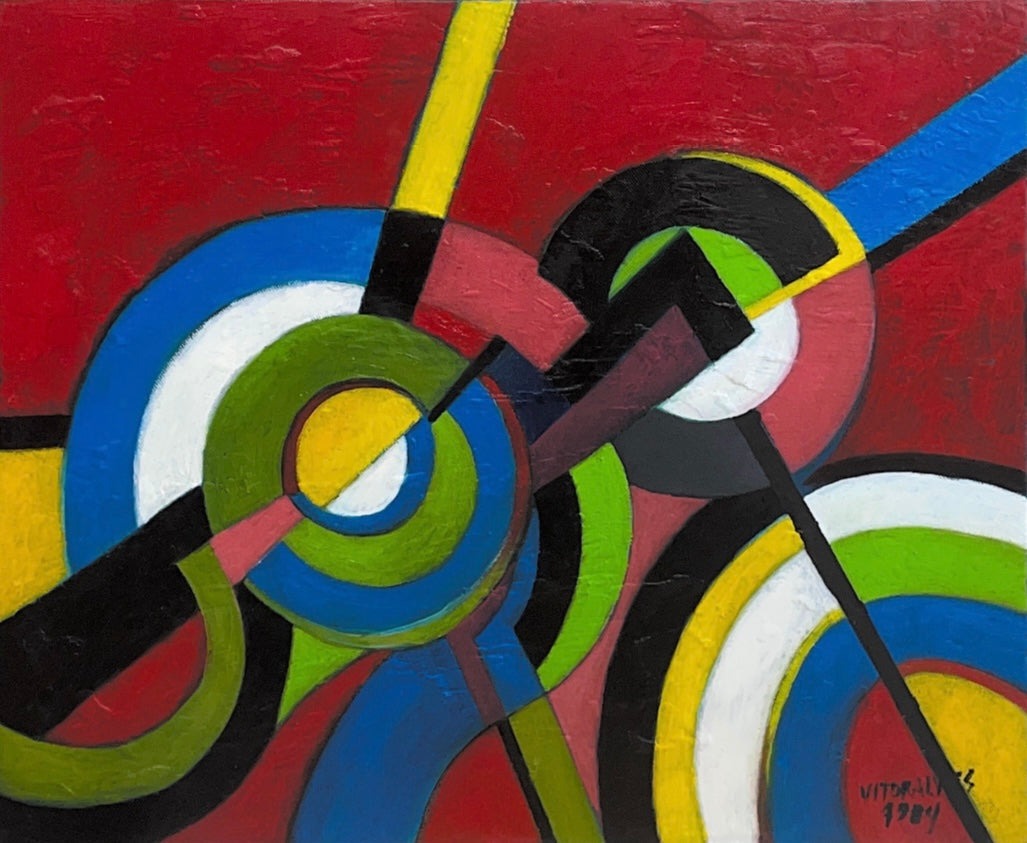 This abstract piece features a series of interlocking circles and geometric shapes in bold colors against a deep red background. The composition's symmetry and balance, along with the vibrant color scheme, create a visually striking and harmonious effect, symbolizing interconnectedness and unity.