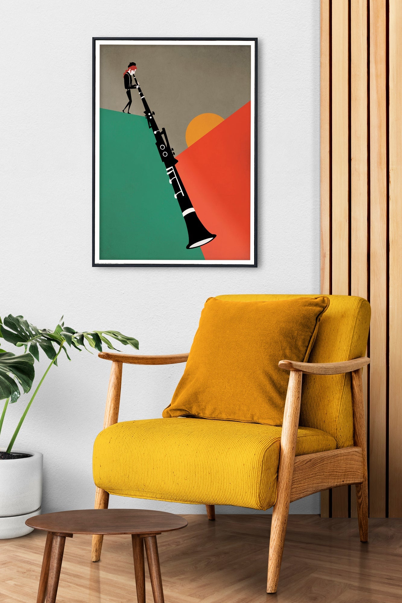 A minimalist and modern illustration featuring a musician ascending a towering clarinet, as if climbing a mountain. The geometric background of green, red, and a golden sun creates a harmonious contrast, adding a sense of exploration and progression.