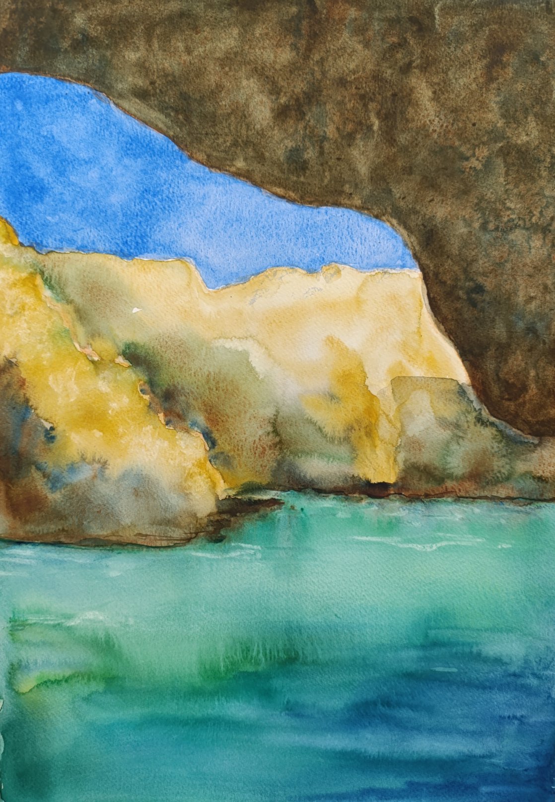 Serene watercolor painting that beautifully captures the natural landscape of towering cliffs meeting the calm, turquoise waters below. The rich earthy tones of the cliffs contrast with the bright blue sky, creating a harmonious balance of warm and cool colors. The artist's delicate use of gradients in the water gives the impression of depth and tranquility, while the textured cliffs add a sense of rugged beauty. This piece evokes a peaceful moment by the seaside, perfect for lovers of nature and coastal landscapes.