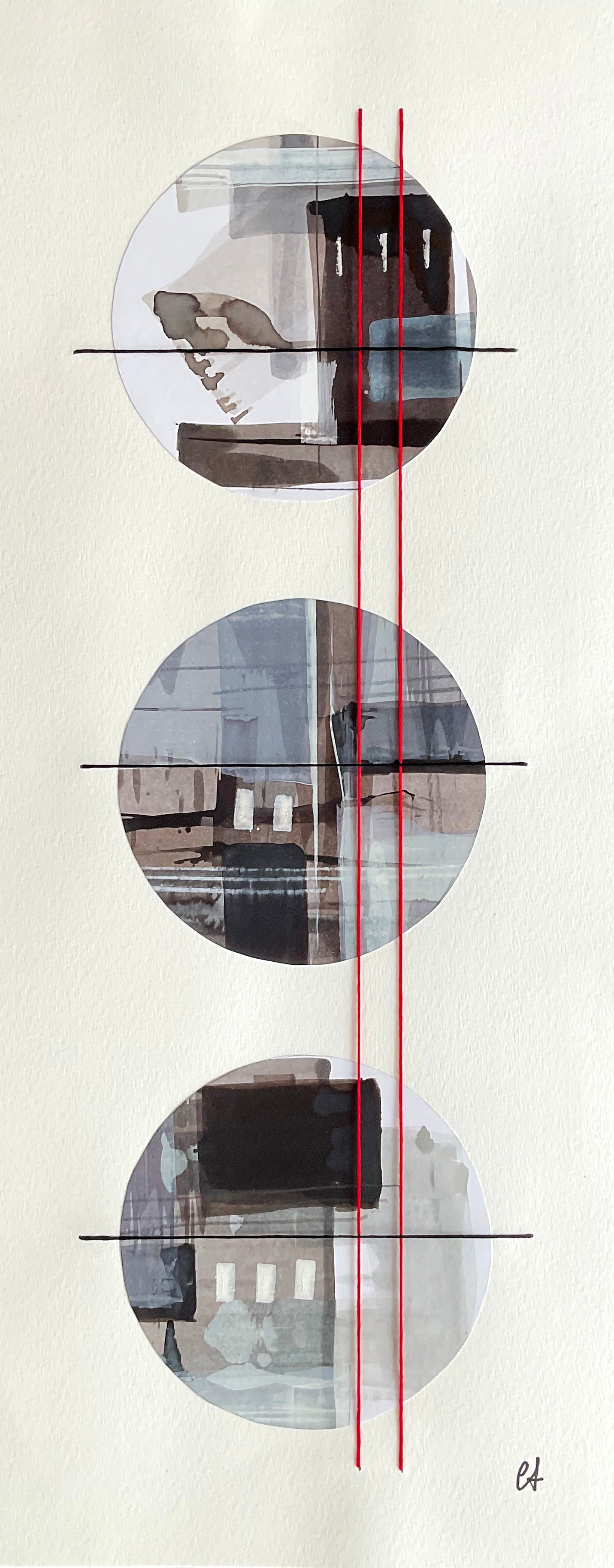 Close Up #1 from the Close Up Series presents a striking interplay of geometry and texture. Utilizing a mix of muted grays, earth tones, and structured lines, this piece brings a sense of modern abstraction to familiar forms. Red vertical lines disrupt the monochrome palette, providing a bold contrast that draws the viewer’s eye through the composition. The circular frames encapsulate layered elements, creating depth and evoking a sense of urban architecture viewed through fragmented lenses.