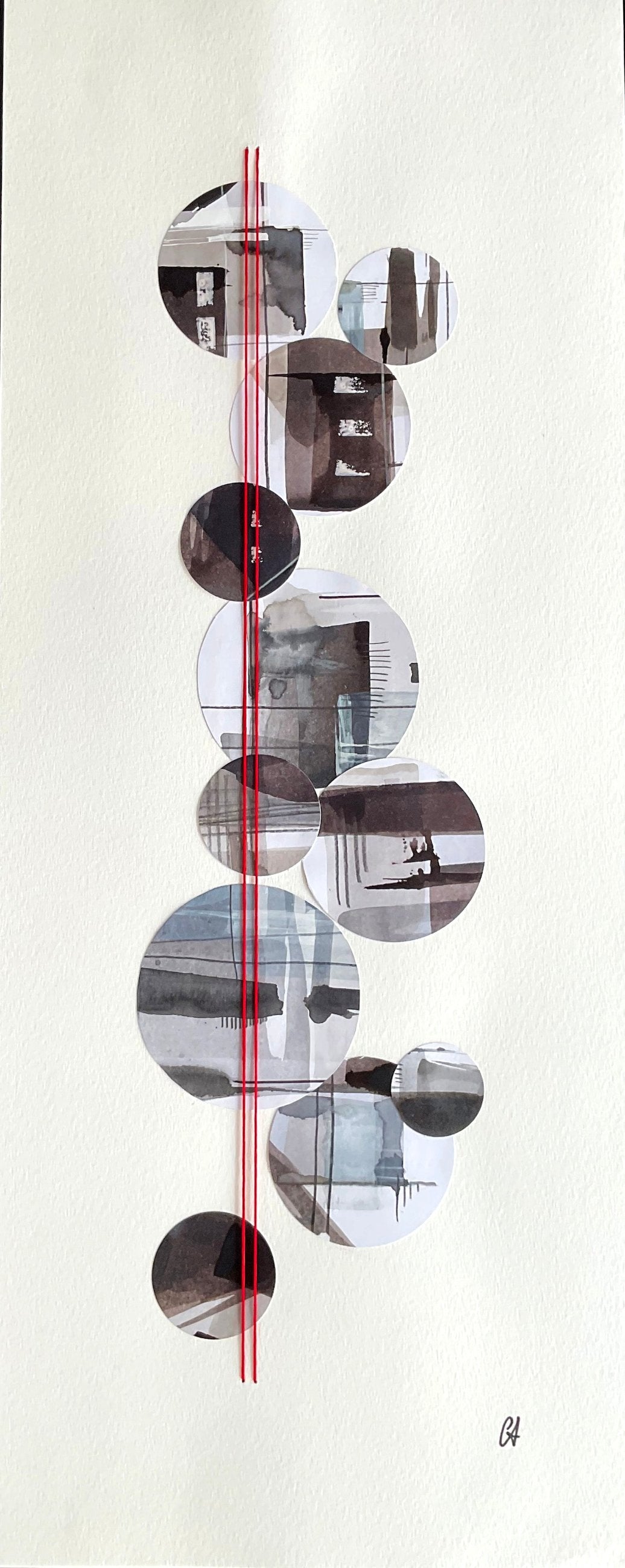 Close Up #2 from the Close Up Series is an exploration of spatial abstraction, using intersecting circles to create a visually engaging composition. Subtle shades of gray, black, and earthy tones dominate the imagery, echoing elements of architectural forms. Red vertical lines disrupt the monochromatic scheme, adding a touch of contrast that draws the eye along the piece’s vertical axis. This interplay of shapes and colors encourages the viewer to delve deeper into each circular frame, discovering layers and textures within.