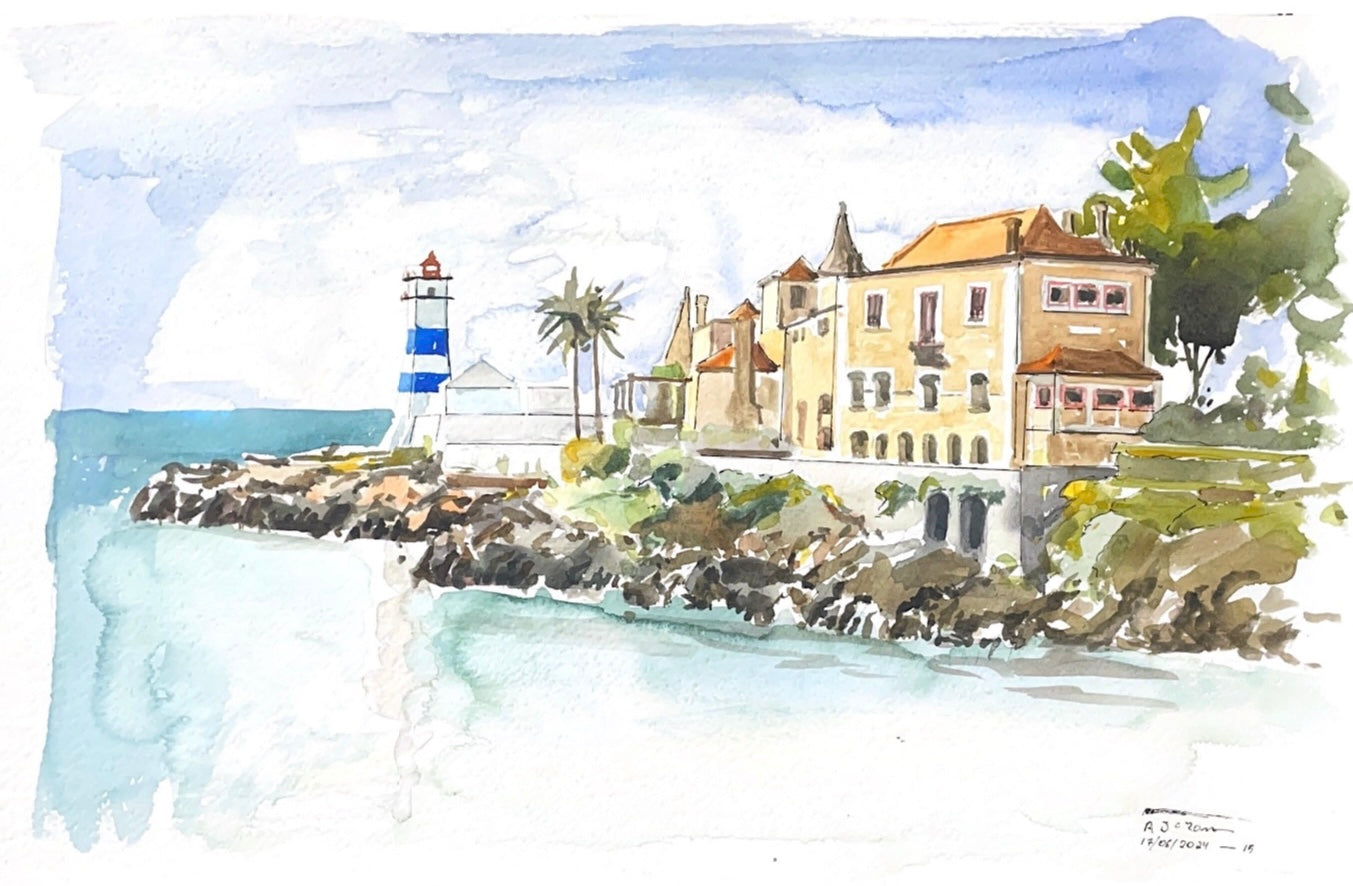 This watercolor painting depicts a tranquil coastal scene featuring a picturesque lighthouse. The lighthouse stands tall with its distinctive blue and white stripes, guiding the way for sailors. Surrounding it are quaint buildings and lush greenery, all set against the backdrop of a calm sea and clear blue sky.