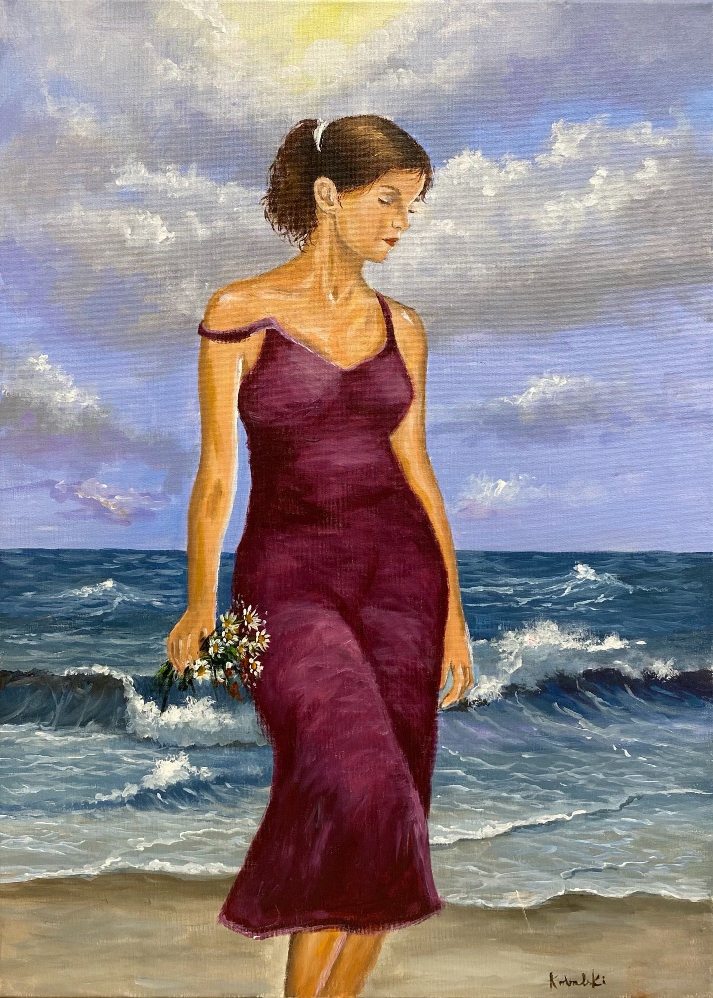 A contemplative woman standing by the ocean’s edge, her gaze turned downward in quiet introspection. Clad in a flowing burgundy dress, she holds a small bouquet of daisies, adding a touch of tenderness to the scene. The dynamic waves and moody sky contrast with her calm demeanor, creating a harmonious balance between movement and stillness. This painting captures a fleeting moment of solitude and connection with nature, as if she is listening to the secrets of the sea.