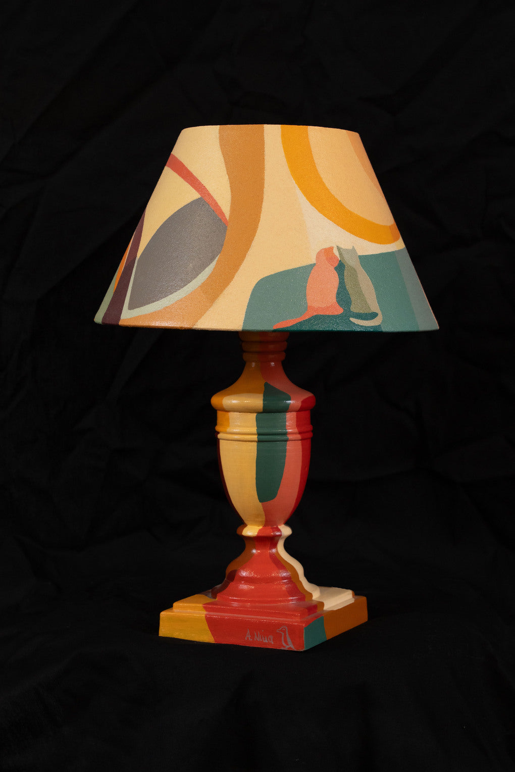 "Colorful Contemplation" is a playful yet thought-provoking lamp with a base and shade that are masterfully painted to create an abstract representation of contemplative scenes. This functional art piece blends utility with aesthetic pleasure, featuring bold, harmonious colors and abstract forms that suggest the interaction of light and shape.