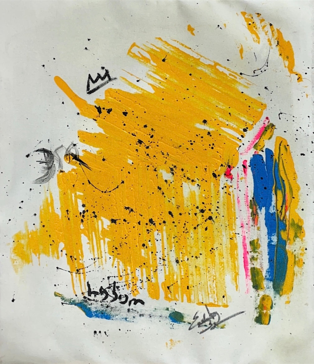 This piece showcases vibrant yellow brushstrokes juxtaposed with accents of blue, pink, and green. The scattered specks and random scribbles add a playful, chaotic element to the composition, highlighting the artist's uninhibited expression of creativity and emotion.