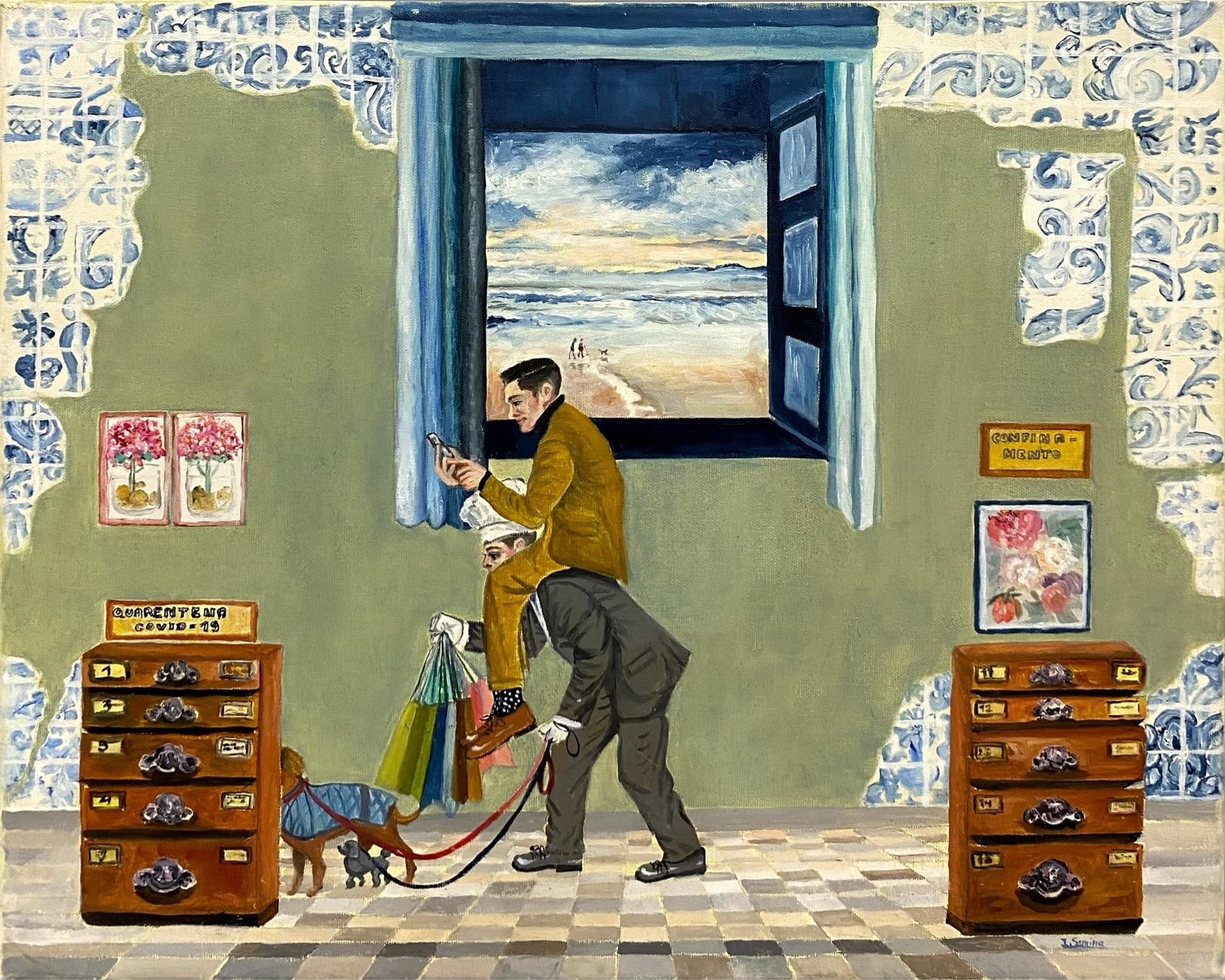 A surreal portrayal of the pandemic era, capturing a whimsical yet poignant scene of quarantine life. The painting juxtaposes indoor confinement with an open window to a beach, symbolizing the longing for freedom. The characters, humorously engaged in mundane activities like checking phones, shopping, and walking the dog indoors, embody the bizarre adaptations of life under lockdown. Traditional Portuguese tiles adorn the walls, grounding the piece in cultural familiarity, while subtle signs like "Cuarentena COVID-19" and "Confinamento" hint at the global experience. This artwork humorously reflects on resilience, monotony, and the small acts of normalcy we clung to.