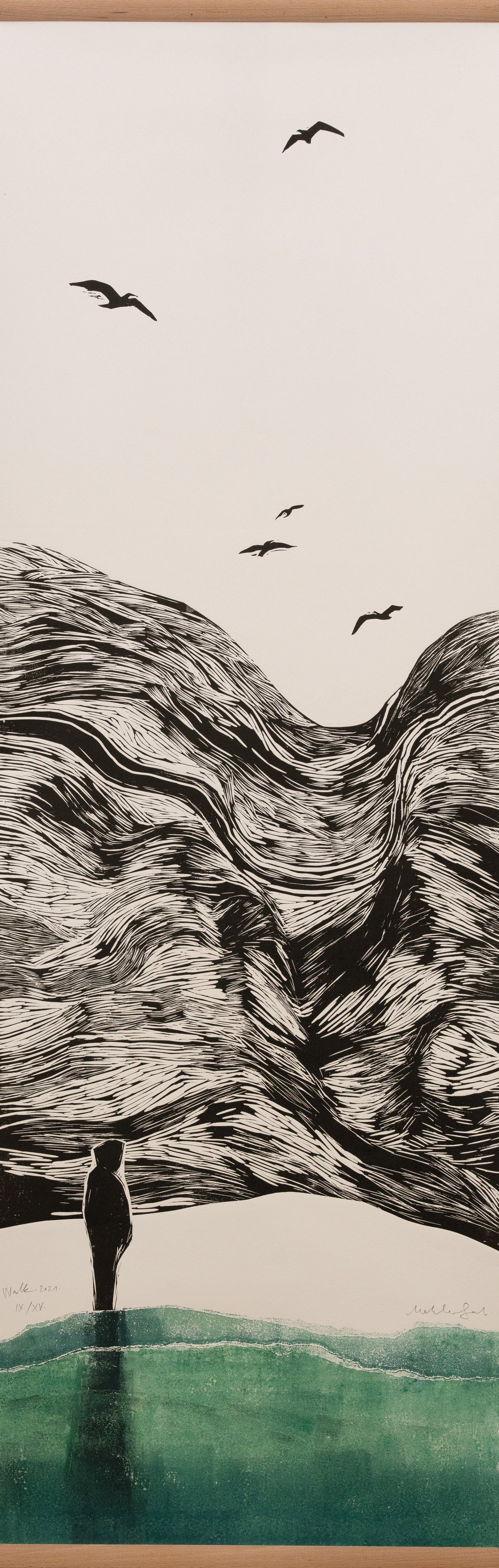 "Contemplative Horizon" presents a striking image of a solitary figure standing at the edge of a calm sea, gazing toward an imposing, wave-like mountain range. The birds soaring in the sky add a sense of freedom and movement, contrasting with the stillness of the figure and the sea. The artwork evokes a feeling of introspection and connection with nature.