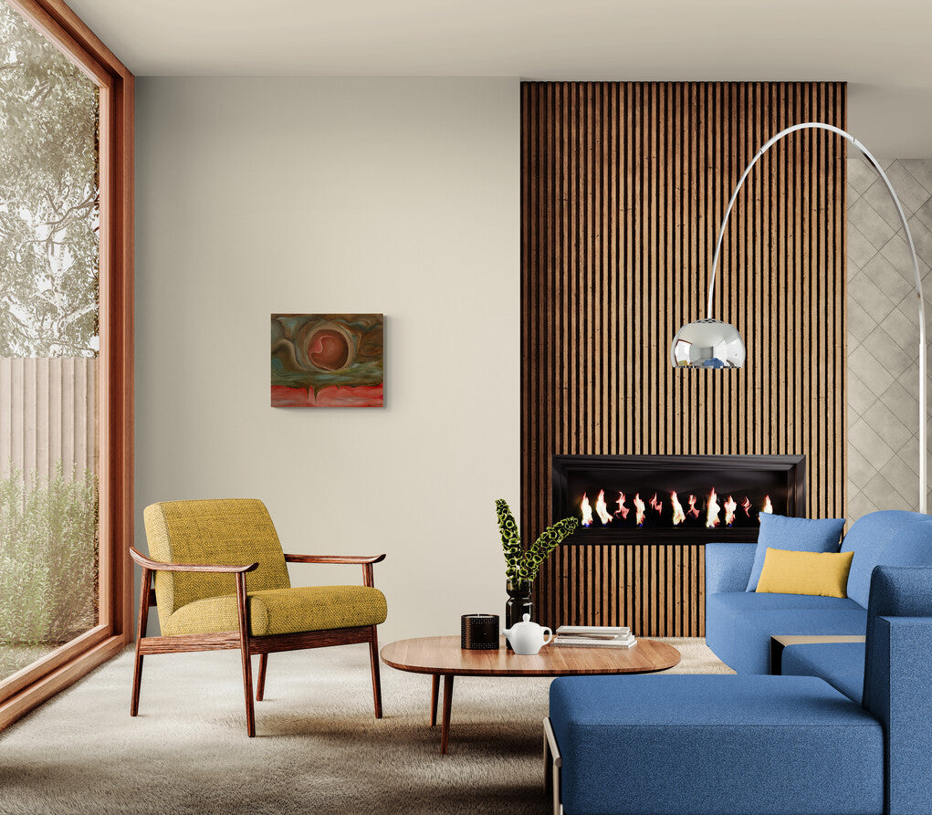 This abstract painting evokes a sense of creation and cosmic energy. The central swirling form, resembling a nascent celestial body or an embryonic shape, is enveloped by flowing, organic layers of earthy and celestial tones. The use of rich browns, greens, and reds, along with the fluid forms, suggests the dynamic interplay between the earthly and the ethereal, capturing a moment of profound transformation and genesis.
