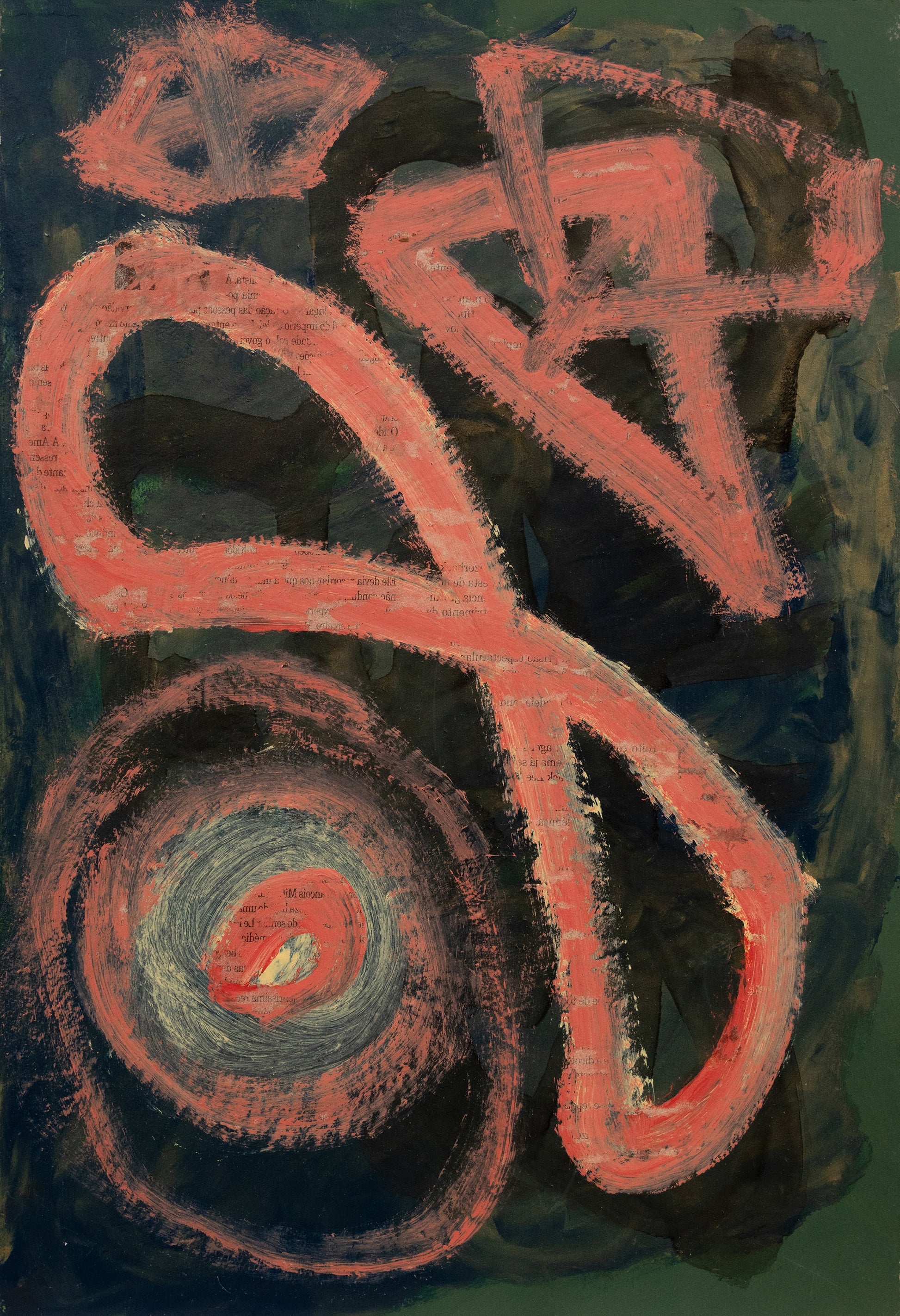 This abstract piece features swirling, interconnected shapes that evoke a sense of cosmic movement. The bold use of red and black creates a dynamic, energetic composition that draws the viewer into a dance of forms and colors.