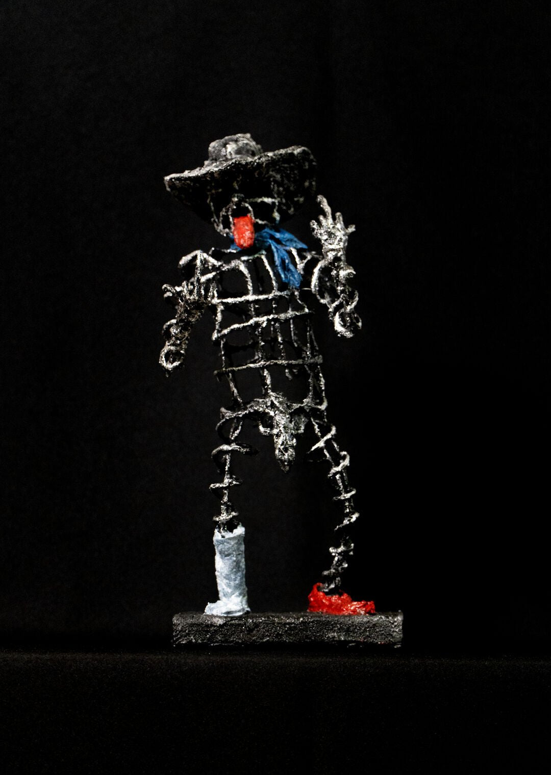 A striking wire sculpture that captures the essence of a solitary figure with a rugged charm. Fashioned from twisted metal and painted with a minimalist palette, the cowboy’s skeletal structure exudes a sense of resilience and character. With one boot painted red and the other blue, the figure's stance reflects individuality and a touch of whimsy. A blue scarf around his neck and a red band on his face suggest subtle details of personality and style, while the wide-brimmed hat completes his classic cowboy look. This piece balances raw, industrial materials with expressive artistry, creating a unique figure that feels both timeless and contemporary.