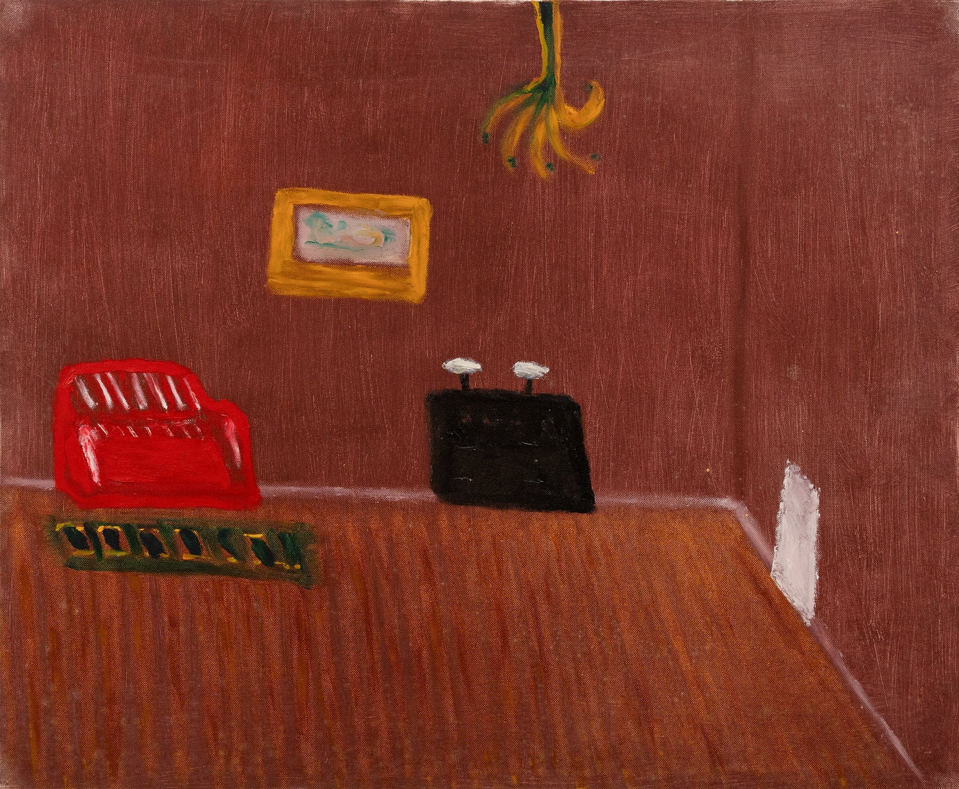 A simple interior scene with a red chair, a black chest, and a framed picture on a rich, warm wall. The minimalist composition and bold use of color create a sense of warmth and comfort, reflecting a cozy, intimate space.