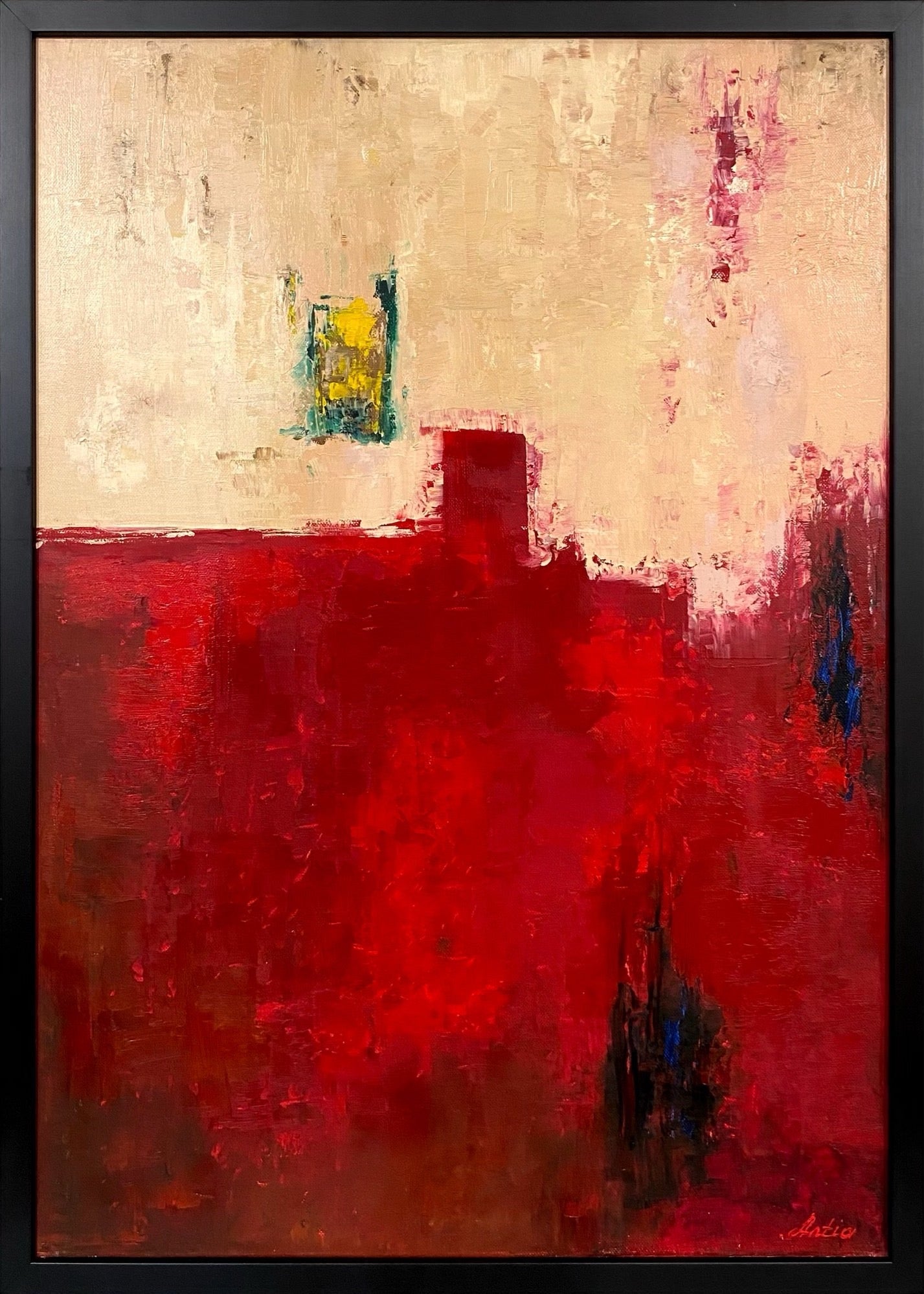 A powerful abstract work that invites the viewer to delve into a world dominated by intense shades of red, contrasted with patches of lighter tones and small accents of green and blue. The layered texture and brushstrokes add depth and movement, evoking a landscape seen through the haze of memory or emotion. This piece captures a sense of warmth and raw intensity, drawing the viewer into a world both familiar and surreal, where color itself tells the story.