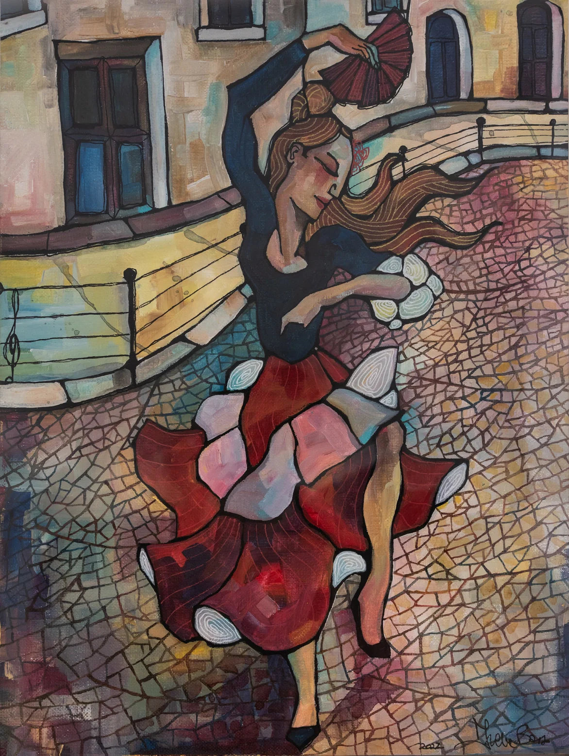 Her dress, a whirlwind of reds and creams, flares around her in a mimicry of the fiery heart that beats within her chest. It's as if the very fabric is alive, a part of her, moving in harmony with her body, creating a visual symphony that mesmerizes any who happen to witness this private performance. The dress is more than attire; it's a character in this story, a symbol of heritage, of the fiery passion that defines both her and her village.