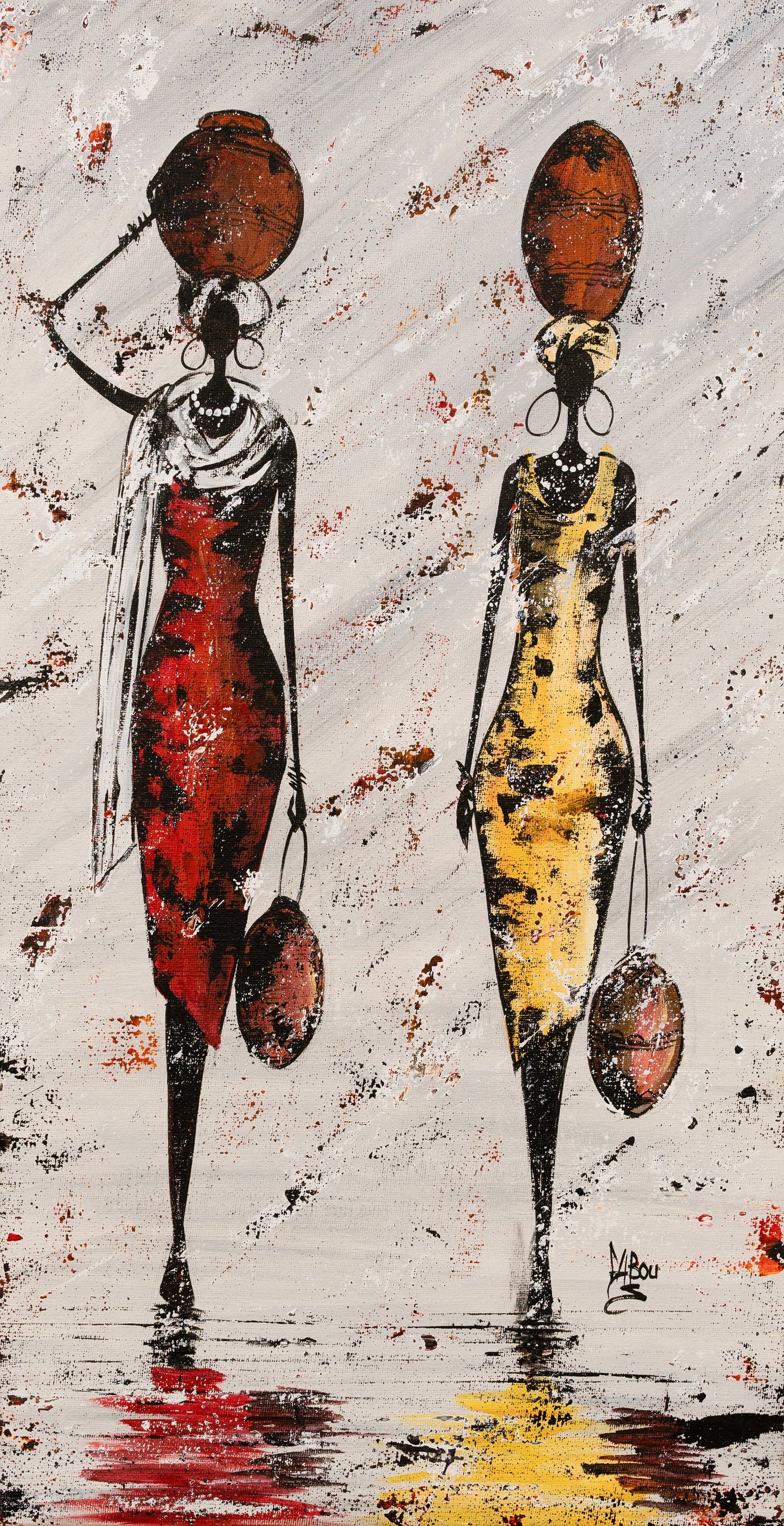Silhouettes of women in traditional attire walk across a desert landscape, rendered in bold, contrasting colors. The simplicity of the forms and the dynamic use of color convey movement and cultural richness.