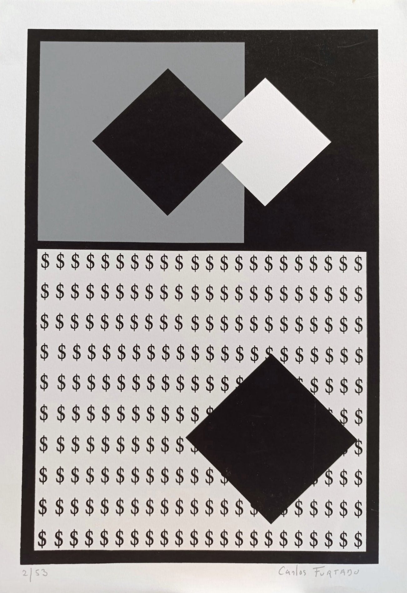 In this piece, Carlos Furtado employs minimalist geometry paired with repetitive symbols of the dollar sign, creating a visual representation of the pervasive influence of commerce and monetary value in modern society. The juxtaposition of black and white diamonds with the repeated dollar symbols highlights the contrasts between wealth, value, and the systems of exchange. The sharp shapes and precision in design add a mathematical and economic dimension to the artwork, encouraging contemplation of materialism and the digital age.