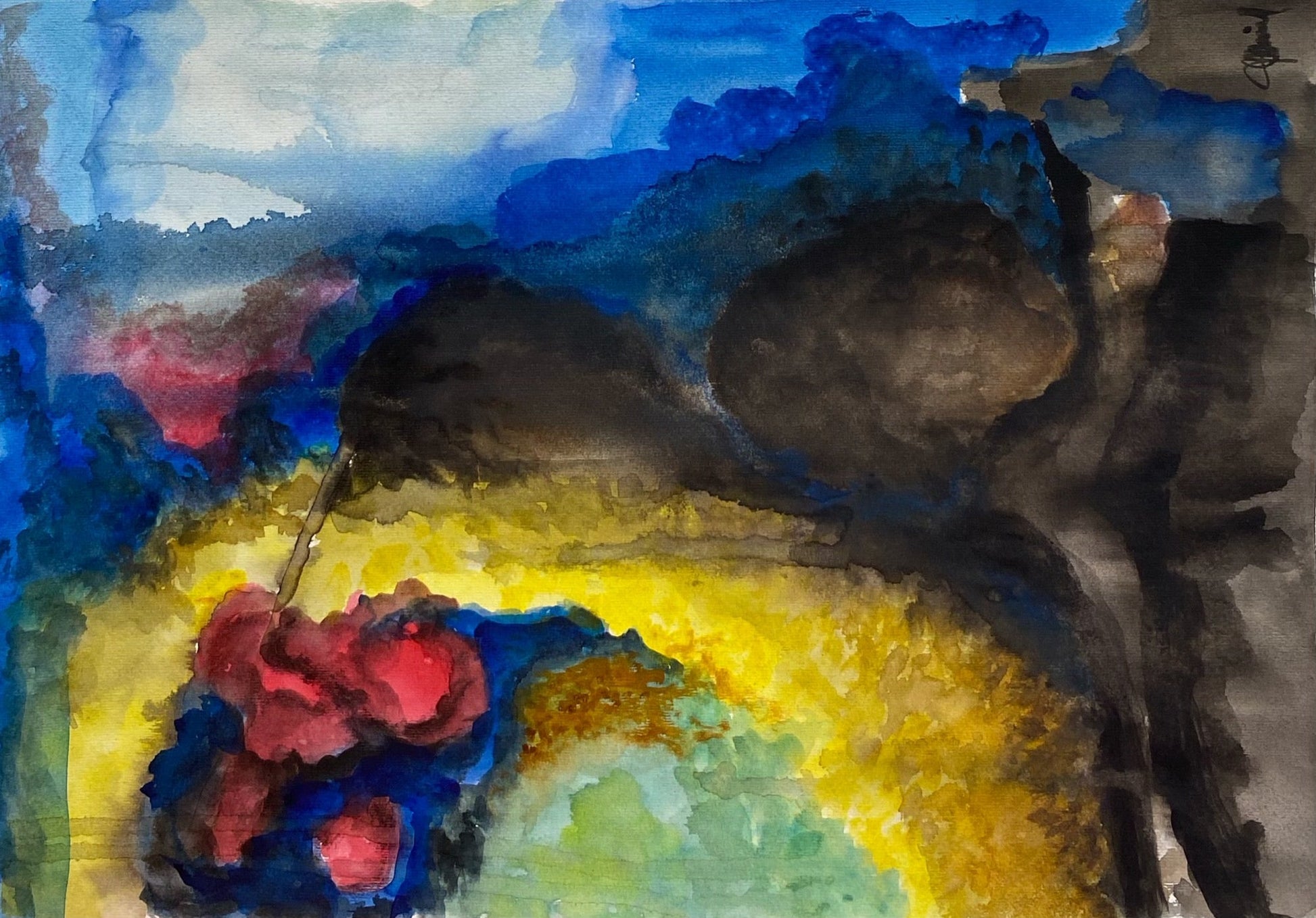 A journey through an abstract landscape of colors and forms that seem to flow into each other, suggesting a distant horizon. The rich, deep blues and soft yellows create a stark contrast, evoking a feeling of both calm and mystery. Dark shapes suggest natural formations, perhaps rocks or mountains, while the splashes of red bring warmth and a sense of hidden life. This piece invites contemplation, as if peering into a surreal memory of a place both familiar and otherworldly.